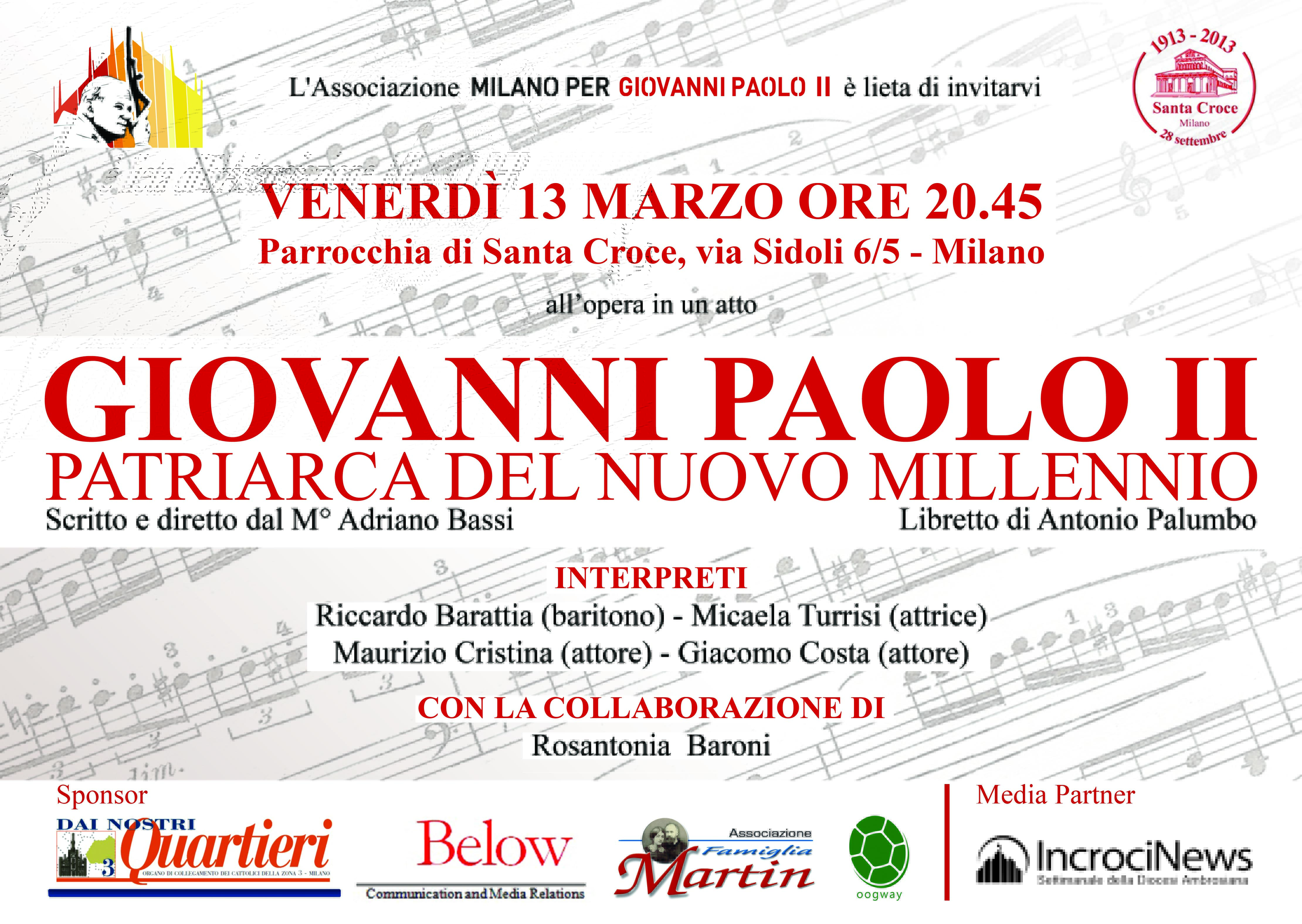 Venerdì 13 marzo, alle 20.45, presso la parrocchia di Santa Croce a Milano (via Sidoli 6/7), l’Associazione Milano per Giovanni Paolo II – impegnata a promuovere la ricchezza della testimonianza umana e spirituale del Papa Santo – propone la rappresentazione dell’opera lirica in un atto Giovanni Paolo II, patriarca del nuovo millennio. Autore è il Maestro Adriano Bassi, concertista di pianoforte, direttore d’orchestra e musicologo. L’opera lirica venne presentata a Giovanni Paolo II e fu eseguita ad Aosta e Villeneuve.