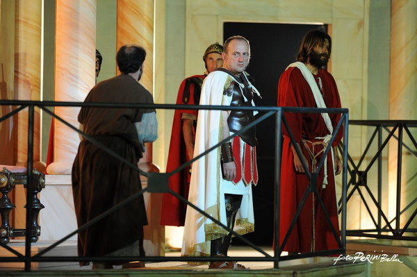 La scenografia, realizzata interamente con i mezzi e le competenze messe in campo dai cittadini, ricostruisce nell’enorme anfiteatro un frammento di Gerusalemme nell’anno 33 d.C.: la reggia di Erode, il Sinedrio, il Pretorio di Pilato, il giardino del Getsemani, il cenacolo, il monte Calvario…