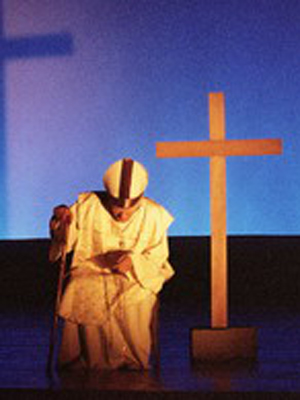 Lo spettacolo si aprirà con un itinerario evocativo attraverso la produzione teatrale e poetica di Karol Wojtyla, la sua esperienza di attore e regista nel Teatro rapsodico clandestino di Cracovia, per poi soffermarsi brevemente sulla scelta sacerdotale e sui tanti volti del lungo pontificato: dai viaggi per il mondo al rapporto con i giovani, dalla grande capacità comunicativa all’esperienza della sofferenza e della malattia, senza dimenticare il pensiero di Giovanni Paolo II sul lavoro, sulla donna, sull’amore, sulle altre grandi religioni monoteiste, sugli avvenimenti che hanno segnato la storia del Novecento (dal nazismo alla caduta del Muro di Berlino). Non mancherà, proprio all’inizio dello spettacolo, un richiamo all’ultima immagine che tutti noi abbiamo del «Papa degli artisti», dell’uomo capace di radunare folle oceaniche e di conversare con la stessa sensibilità e attenzione con gli umili come con i potenti: quella del funerale, con il feretro dalla semplicità francescana e l’evangelario sfogliato dal vento.