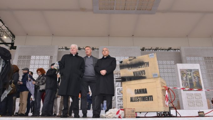 Due grandi torri in alluminio e ferro a sorreggere la copertura, come i pilastri di un ponte gettato da un lato all’altro del lungo frontale, a evocare lo scambio e l’incontro tra culture e fedi, e il fondale in pannelli di legno riciclato che riproduce la decorazione del Duomo di Monza: questa la struttura ideata dall’architetto Claudio Santucci e realizzata dalla società Safe event solutions. Su una superficie di oltre 400 mila mq tre aree: sulla sinistra la grande tribuna a gradoni per coro e orchestra; al centro l’altare liturgico e le sedute dei celebranti; a destra l’area riservata ai disabili. Montati anche 6 maxischermi 10×8 m.