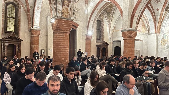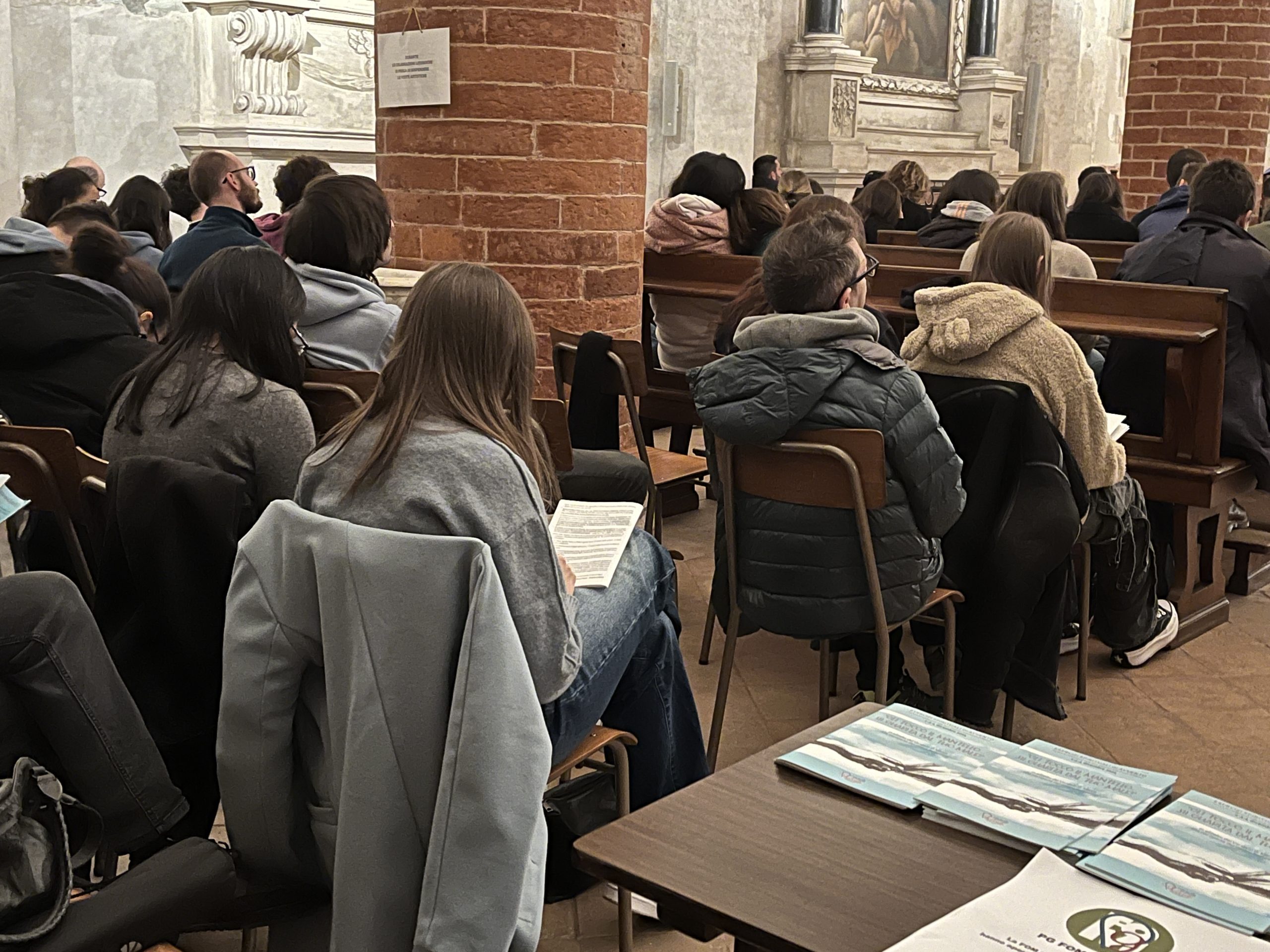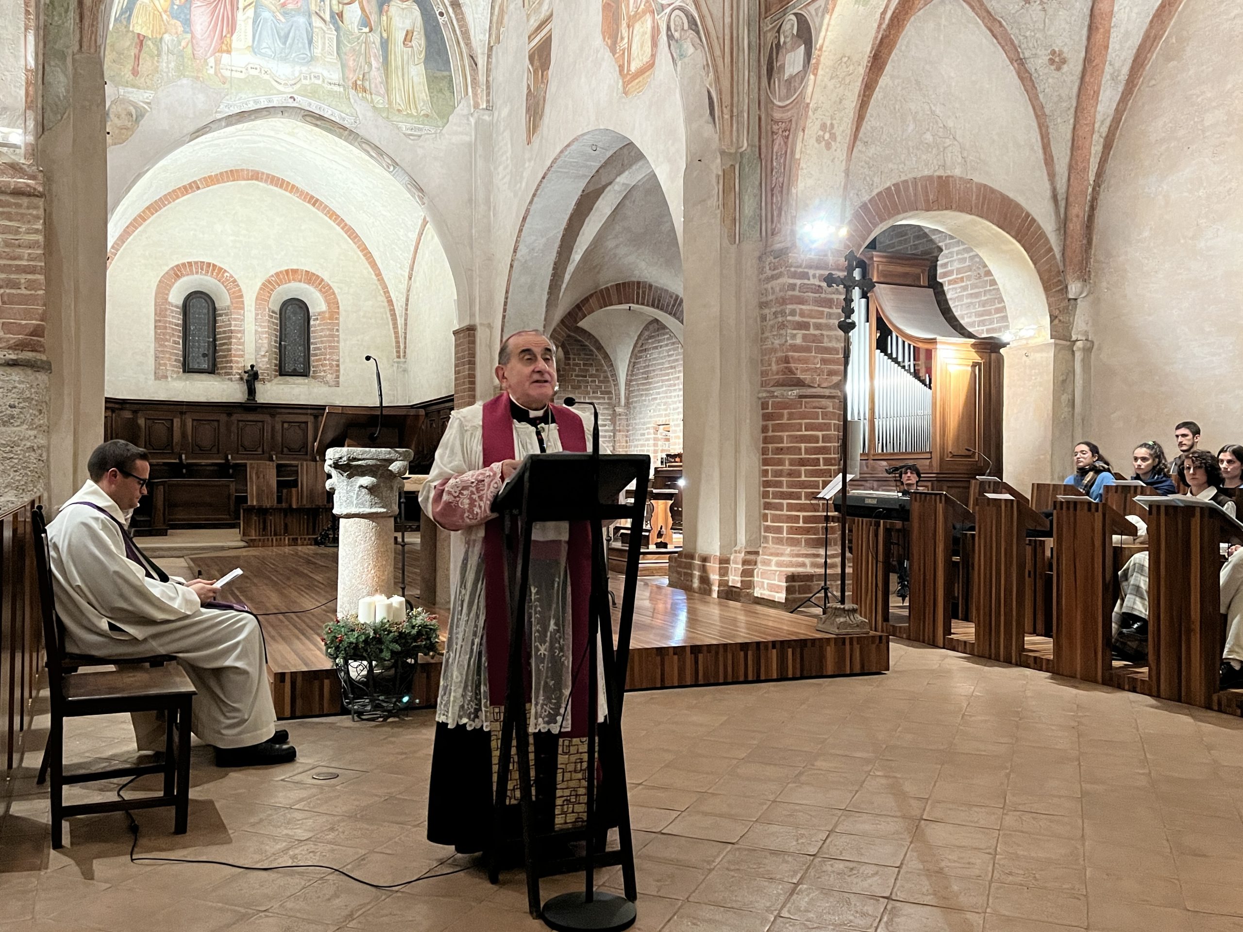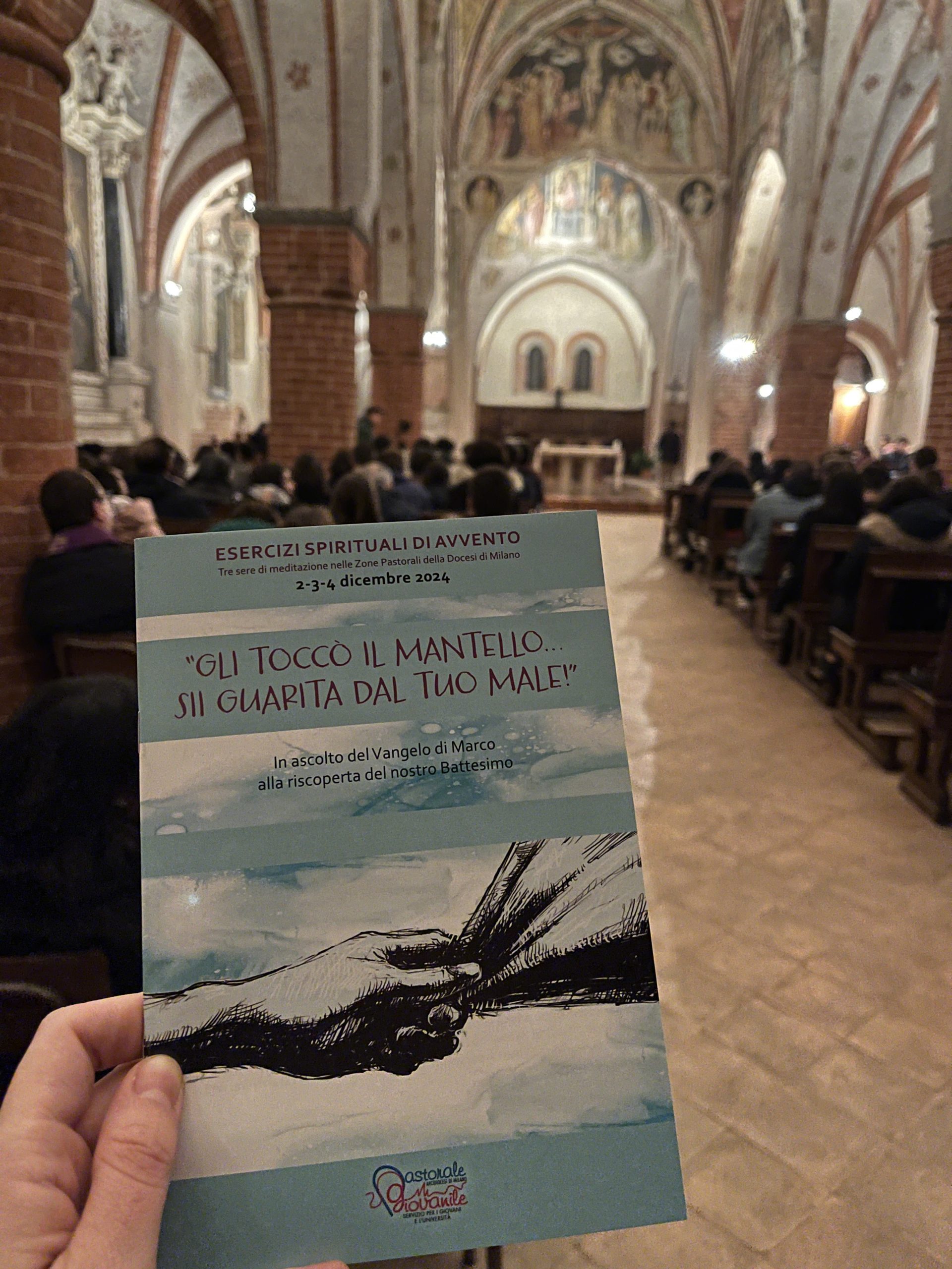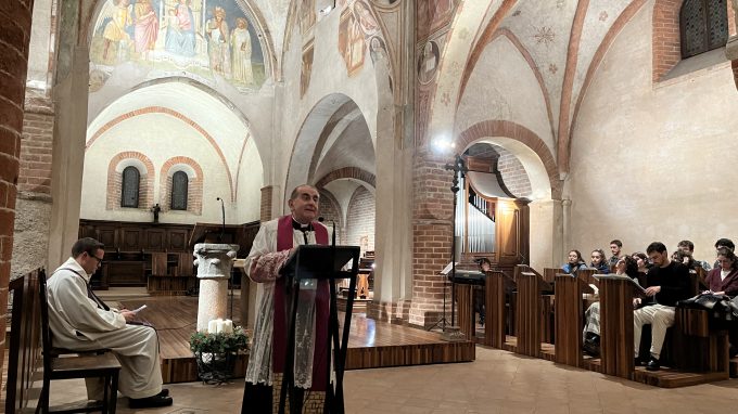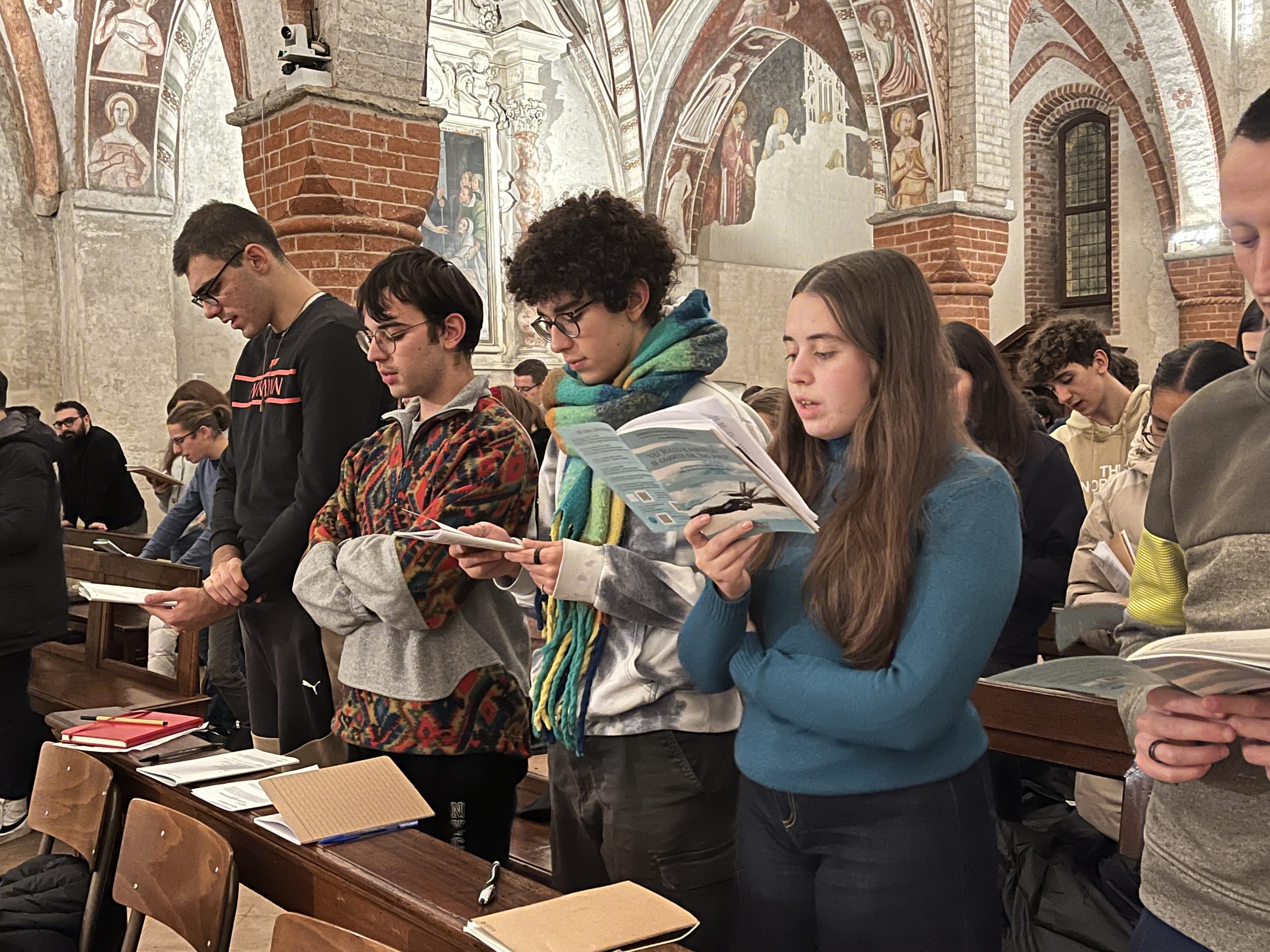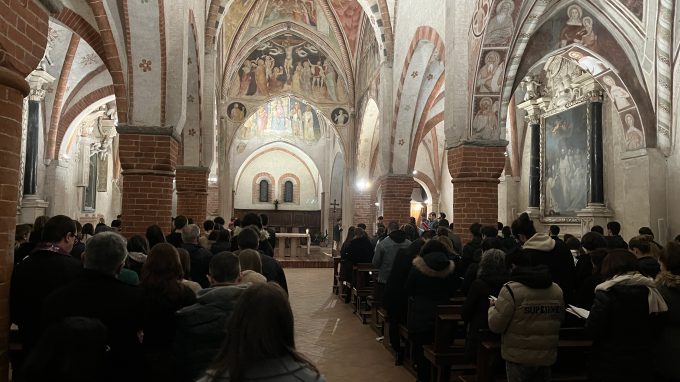 Nella meditazione dell’ultima sera di Esercizi spirituali d’Avvento (4 dicembre 2024) abbiamo ascoltato il brano della “Professione di fede di Pietro e primo annuncio della Passione”. Le parole dell’Arcivescovo Mario Delpini ai giovani hanno risuonato nell’Abbazia di Viboldone: un vero tesoro medievale sospeso nel tempo, ancora più suggestivo con gli affreschi trecenteschi illuminati nelle luci della sera