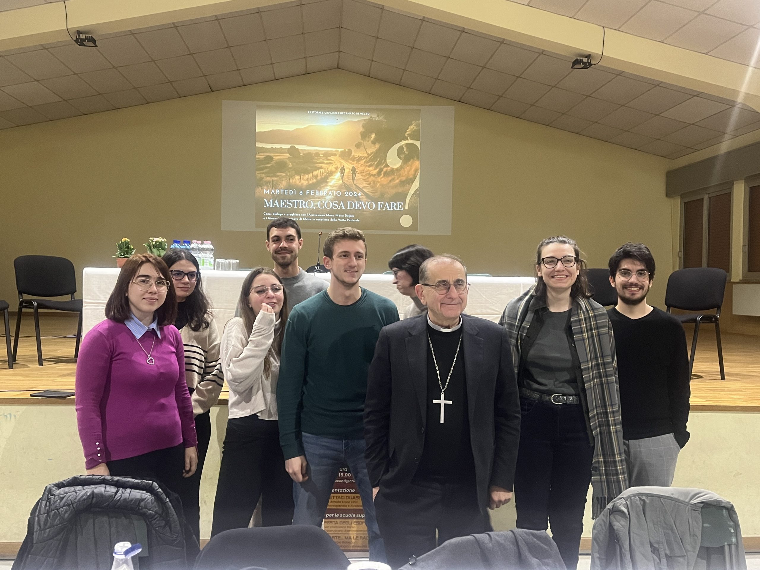 Per riconoscere l’agire di Dio e scegliere di seguirlo, altre riflessioni pongono l’accento sul discernimento: «Come possiamo ricercare la bellezza nelle piccole cose, dopo la Bellezza vissuta alla GMG? Come vedere Dio in ogni istante? È difficile cogliere la sua presenza nella frenesia… La mia vita come può essere una risposta del suo amore per me, con la mia storia, i miei limiti e la mia piccolezza? Come si può cambiare sguardo se si ha una “vista annebbiata”? Come accogliere l’inquietudine che si presenta a volte nella vita, come qualcosa di positivo, che ci rimette in discussione? Quando le mie certezze cadono, dov’è Dio? Come può aiutarmi effettivamente? Abbiamo voglia di essere santi?». «La santità cristiana – afferma l’Arcivescovo – è l’esperienza di essere amati e di essere capaci di amare. Il nostro Dio Padre vuole che noi siamo felici. Come si fa a essere felici? Prima di tutto avere non solo la convinzione ma la persuasione, l’esperienza, di essere amati per quello che si è, non perché meritato… e questo amore mi rende capace di amare, voler bene, dedicarsi al bene degli altri». Per rispondere a che tipo di aiuto può darmi Dio, per sostenere il peso e l’angoscia, cita il brano “La Notte” di Elie Wiesel, cifra del male assoluto di Auschwitz: «Dietro di me sentii il solito uomo domandare: Dov’è Dio. E io sentivo in me una voce che gli rispondeva: Dov’è? Eccolo: è appeso lì, a quella forca». «Dio è sulla croce – dice l’Arcivescovo – non come l’idea di uno che mette a posto le cose, di un Dio fantastico che prego per i “casini” che ho. Condivide la mia storia… Come mi aiuta? Come fa ad aiutarmi se è un “fallito”, un crocifisso? Dalla morte di Gesù ci dona lo Spirito di Gesù perché abiti nei nostri cuori: siamo tempio dello Spirito Santo che ci rende capaci di amare in ogni situazione. Sulla bellezza… nel famoso testo di Dostoevskij si afferma “La bellezza salverà il mondo”. Ma quale bellezza? Cos’è la bellezza? Ho capito che c’è la bellezza della seduzione (che fa sì che una persona o una cosa divenga attrattiva, con il desiderio di possederla) e una bellezza che induce all’amore, alla dedicazione». Per cambiare sguardo, e guardare oltre la nebbia, richiama l’episodio dei due discepoli di Emmaus, con Gesù che si avvicina e li accompagna, fin quando lo riconoscono: «Per volersi prendere cura degli sguardi annebbiati, del modo di guardare gli altri, bisogna andare a Messa, per imparare a vedere il pane spezzato come corpo di Cristo».