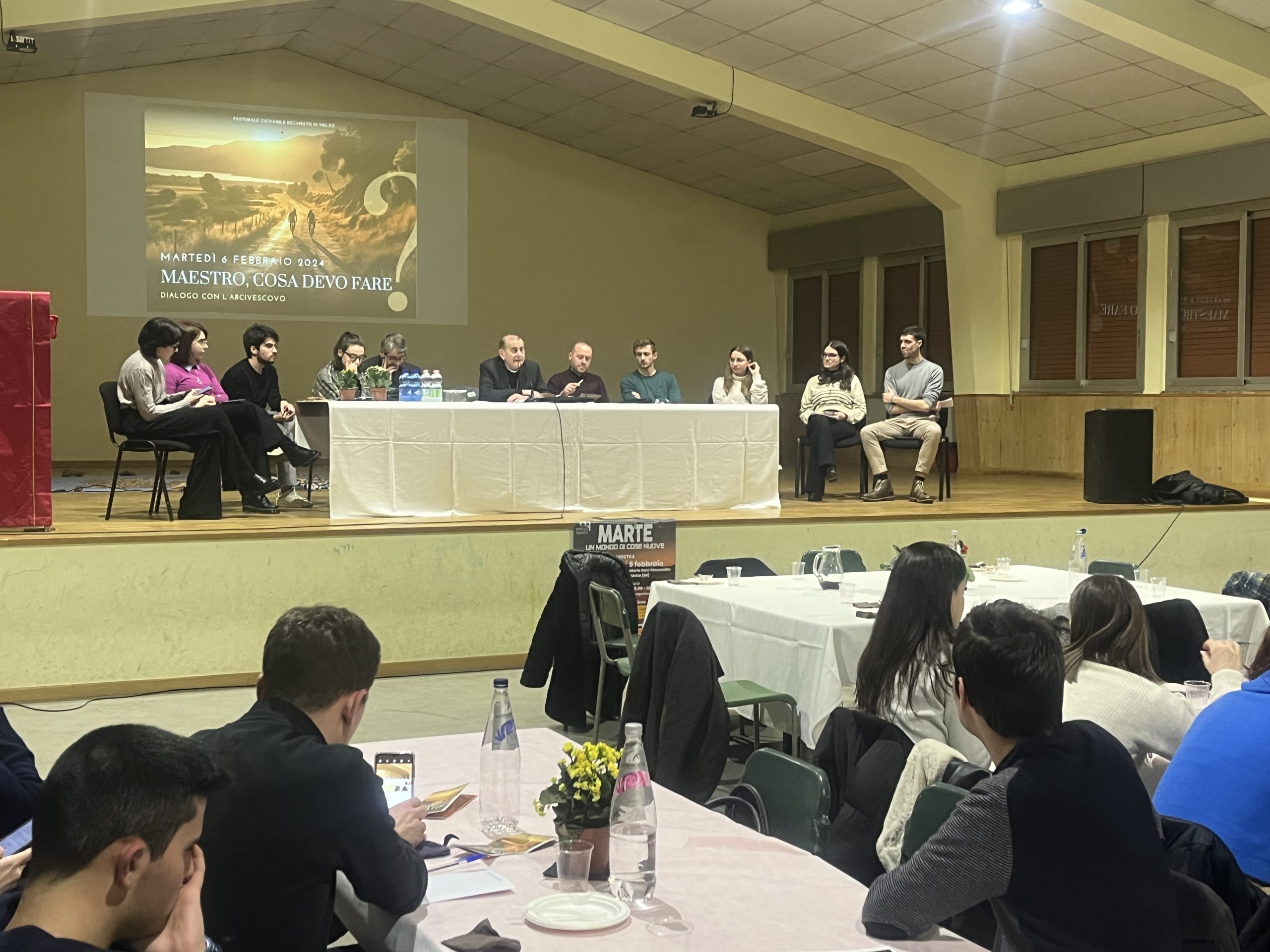 Divenire adulti non è semplice: richiede il confronto tra un aspetto più “pratico” e uno più spirituale, in tensione fra il “compromesso” che una vita chiede e il desiderio vocazionale che dall’altra parte chiede di non accontentarsi. Su questa tema un altro giovane esprime il suo pensiero: «Dove si incontrano il desiderio che ho nel cuore e la volontà di Dio per la mia vita ed il mondo?». Gli risponde l’Arcivescovo: «Tutti siamo chiamati a vivere da cristiani qualunque cosa facciamo. Se vuoi mettere a frutto i tuoi talenti per metterli a servizio, se vivi la tua vita come una dedizione… Fai quello che ti piace, ma è importante la conversione, che tu viva quello che fai come vocazione. Come strumenti che possono aiutare a comprendere la propria strada, per vivere da cristiano quello che mi piace, suggerisco tre punti fondamentali: la preghiera (il dialogo con Gesù vivo, non come una ripetizione di qualche formula ma come il dialogo con un amico, per ascoltarlo occorre un po’ di silenzio), avere un interlocutore di fiducia, affidabile (con cui parlarne e confrontarmi), conoscere se stessi (nelle mie doti, limiti, tentazioni; l’amicizia è un aiuto a conoscere se stessi)».
