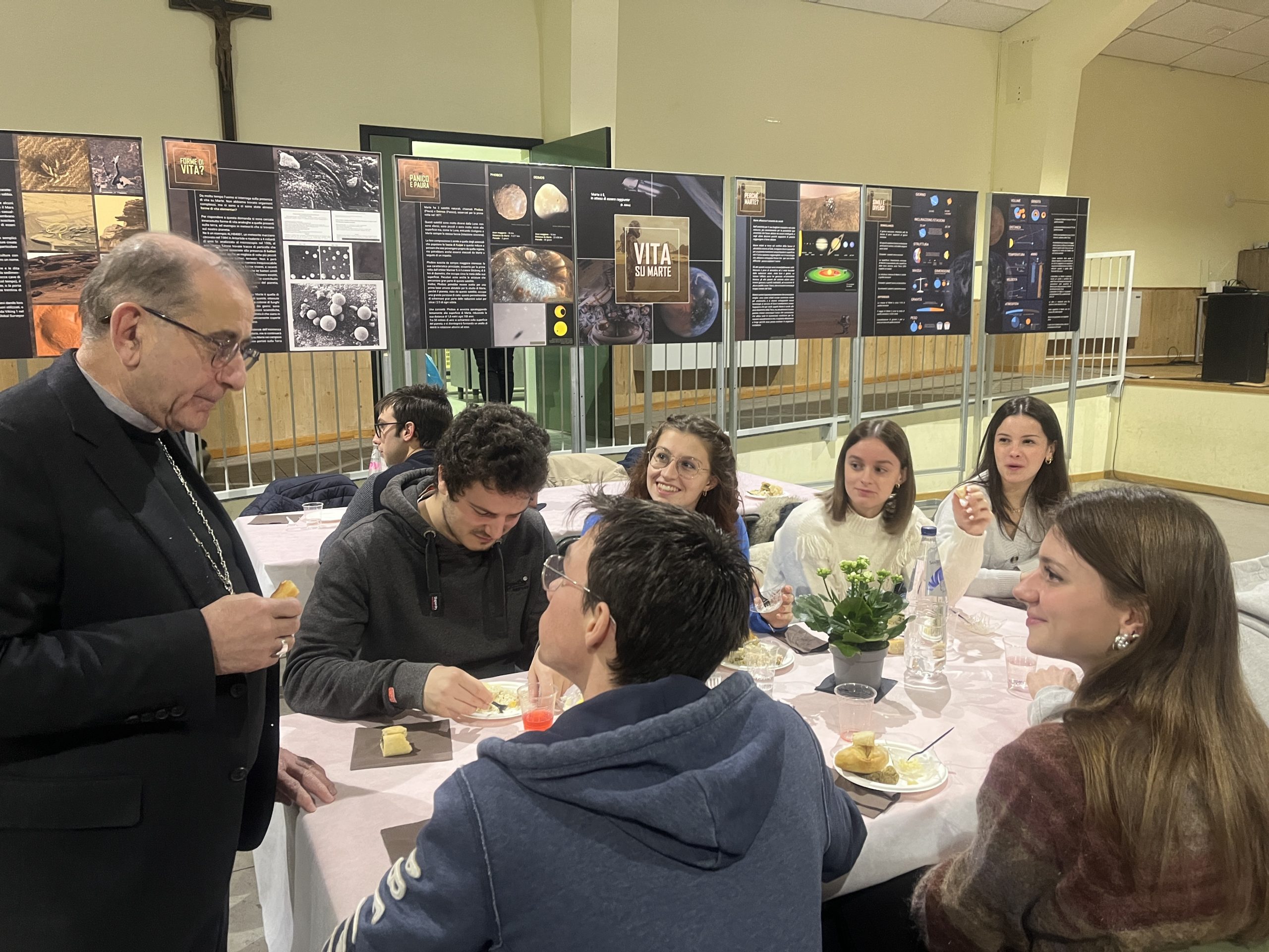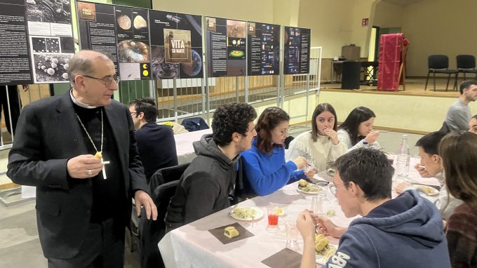 «Quando ero piccolo andavo a Messa e pregavo senza farmi domande. Crescendo, invece…», confida uno dei giovani seduti attorno all’Arcivescovo, che condividendo i primi interrogativi manifesta una sorta di “conflitto interiore”, che insinua dubbi, spezzando una certa abitudine; tutti gli altri giovani, seduti ai tavoli, ascoltano appuntandosi i passaggi che per la propria vita risuonano in maniera più significativa. Il giovane si chiede: «In che modo la comunità o il gruppo giovani può aiutarmi?». L’Arcivescovo in primis sottolinea con forza l’importanza di porre domande: «Farsi le domande vuol dire che sto diventando me stesso. Fate domande tra di voi, il gruppo di amici aiuta la confidenza (credo, a partire dalla mia esperienza, che quel rapporto di reciproco affetto aiuta a diventare migliori, non solo uno star bene insieme, ma ci eleva). Le domande sono legittime, non censuratele. Altra cosa: mi sembra sia giusto pensare all’alternativa, sono sempre andato in chiesa, ho sempre pregato… ma quando mi vengono i dubbi: se non pregassi, se non parlassi con Gesù, se non credessi che Gesù è risorto, è vivo, come sarebbe la mia vita?».