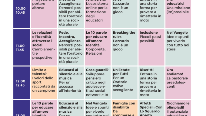 Ogni partecipante potrà costruire il proprio percorso, secondo ciò che serve davvero al proprio oratorio: approfondire ciò che già si conosce, oppure aprirsi a temi nuovi, spesso trascurati ma decisivi nella vita quotidiana dei ragazzi.