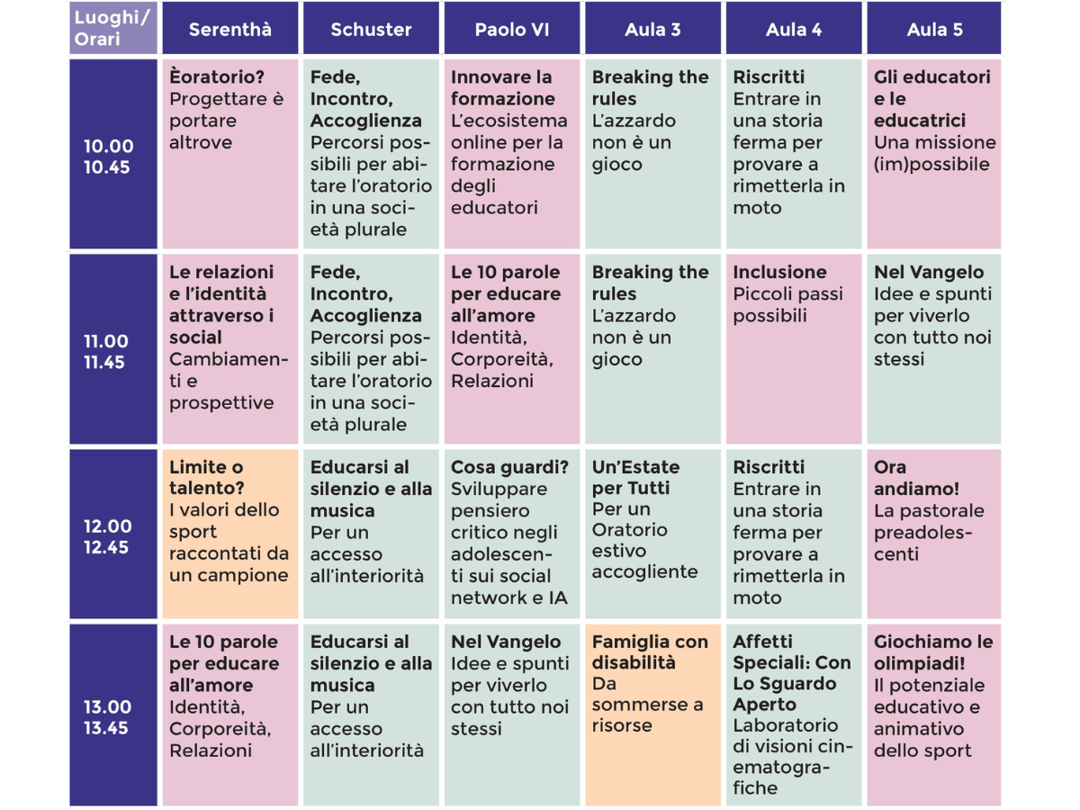 Le aree tematiche riflettono la complessità reale dei nostri oratori: educazione all’affettività; pastorale degli adolescenti e dei preadolescenti; l’educatore e la sua formazione personale; prevenzione del disagio adolescenziale; famiglie con disabilità e inclusione; sport ed esperienze ludico-sportive; corpo, movimento e linguaggi non verbali; intercultura e incontro tra differenze; comunicazione digitale e social media; narrazioni contemporanee (serie tv, musica, creatività); formazione continua con la piattaforma OraMiFormo.