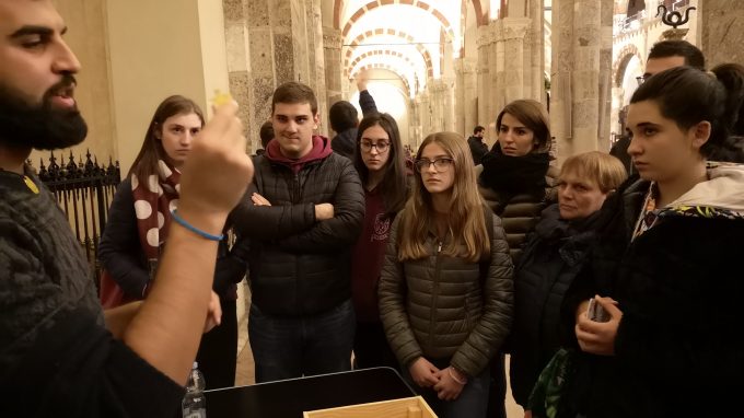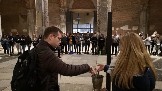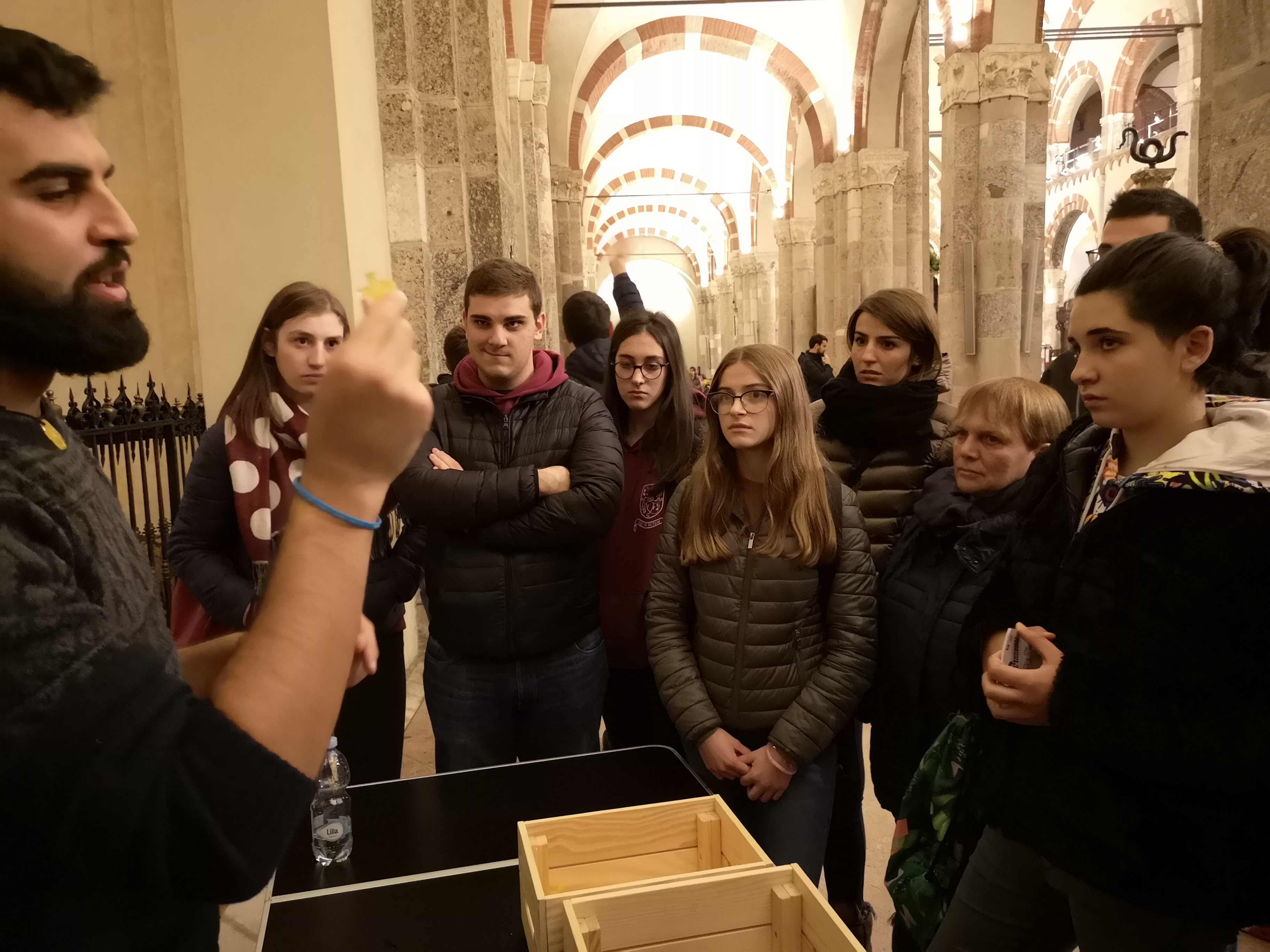 Nella Basilica di Sant’Eustorgio ecco i missionari Saveriani, che condividono con i ragazzi il loro obiettivo e il loro modo di vivere: in comunità, insieme, perché l’altro è mio fratello, nonostante i nostri genitori siano diversi, anche se proviene da Paesi lontani, unendo il mondo sotto la stessa famiglia. Poi ci si mette alla prova con un piccolo gioco, per assegnare le bandiere al missionario di riferimento, e, al termine, il ballo africano Jambo.