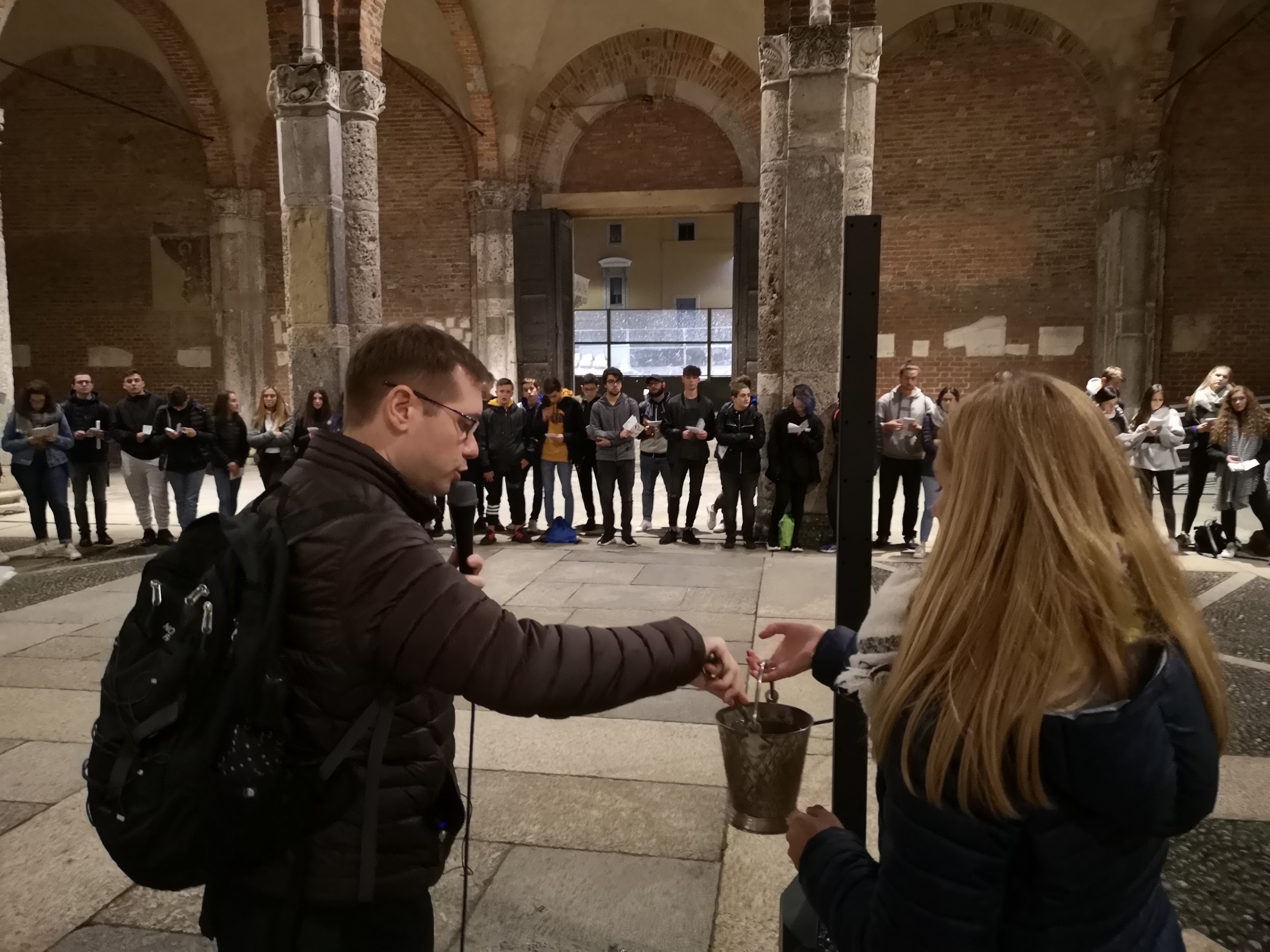 È una Notte speciale quella che vivono gli adolescenti degli oratori ambrosiani. Una Notte dei Santi che sicuramente ricorderanno anche nei prossimi anni… Inizia tutto dalla splendida Basilica di Sant’Ambrogio, dove si raccolgono, a gruppi, con i loro educatori, già dalle ore 18 di giovedì 31 ottobre, nel giorno che segna la conclusione del Mese Missionario Straordinario, voluto da Papa Francesco per richiamare la coscienza che siamo «Battezzati e Inviati». E quale modo migliore se non quello di celebrarlo insieme con gli adolescenti degli oratori, pronti a scoprire il significato di questa Missione a cui tutti siamo chiamati? Lì, nel quadriportico, la Professione di fede e l’aspersione in ricordo del Battesimo. «Proprio quel momento – per lo più vissuto da piccolissimi e di cui ora non abbiamo memoria – segna l’inizio della nostra Missione sulla Terra: siamo diventati figli di Dio e, per la forza dello Spirito, Missionari del suo Vangelo», spiega don Stefano Guidi. «Io sono sempre una missione, tu sei sempre una missione… Ciascuno di noi è una missione nel mondo». Si pensava che era qualcosa da fare, la Missione, e, invece, si inizia a percepire che è più vicina ad un modo di essere, ad uno stile da tradurre, concretamente, nelle scelte di ogni giorno. Guardiamo ai Santi, alla loro luce, alla loro vita riuscita… dal punto di vista dell’essere inviati, mandati: la grandezza dei Santi è stata quella di essere persone che non hanno vissuto per se stesse ma donando la vita, lasciandosi mandare e inviare agli altri.