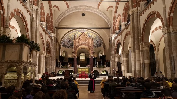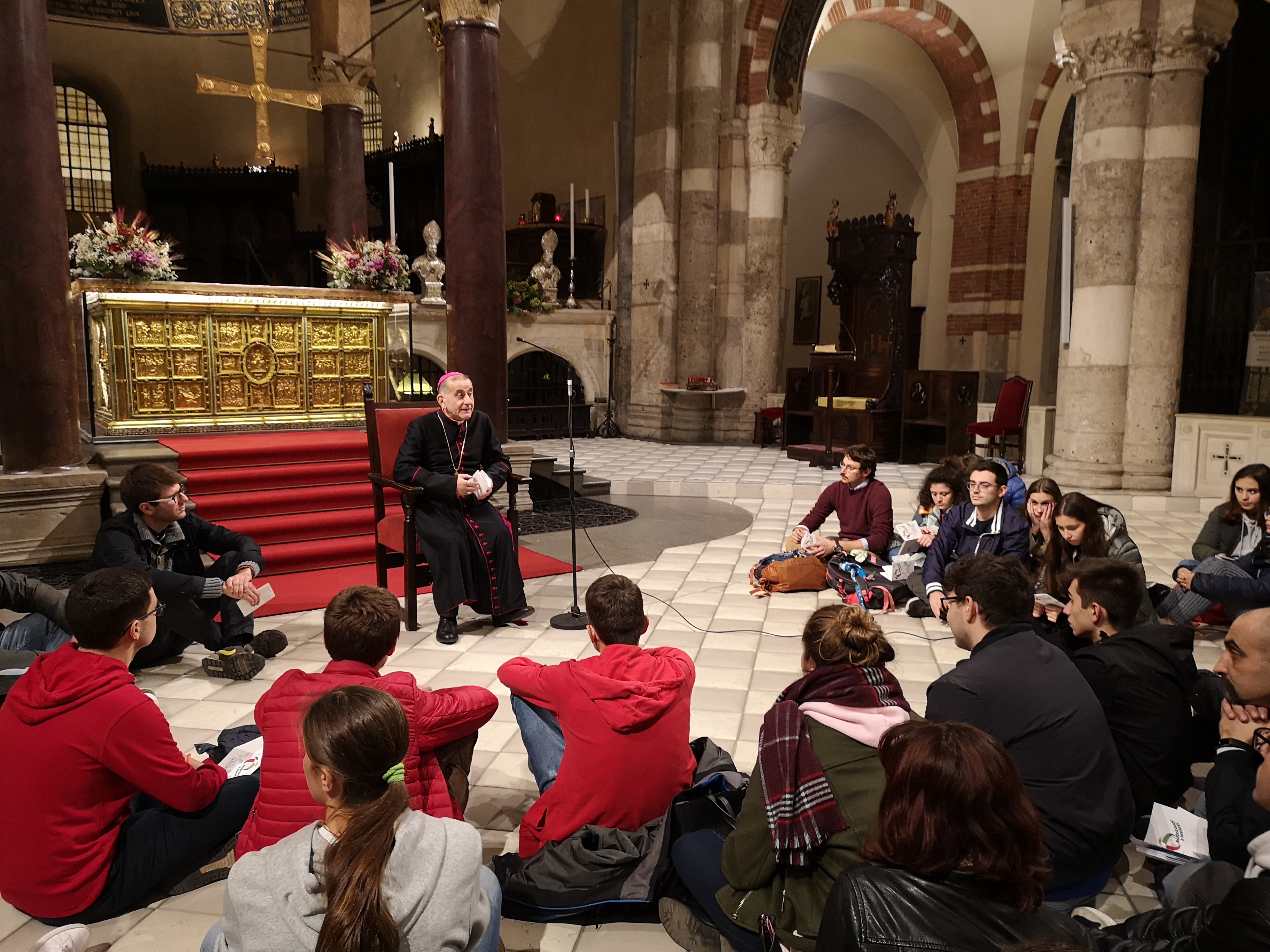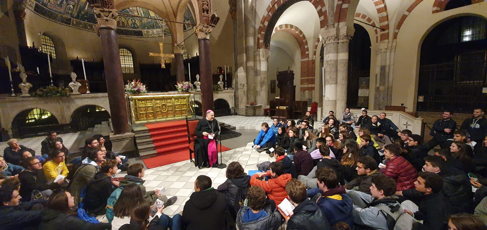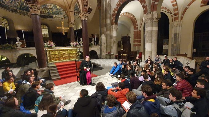 I gruppi successivi incontrano altri Vescovi ausiliari della Diocesi, come monsignor Erminio De Scalzi che spiega «la differenza tra i missionari a vita, quelli che abbandonano il proprio Paese, portando via qualche libro, la Bibbia in particolare, per recarsi in un Paese lontano… e poi ci sono i missionari con la vita, ciascuno di voi. Cosa vuol dire essere missionari? Quando uno riceve una bella notizia, non se la tiene per sé, sente il desiderio di donarla agli altri», monsignor Franco Agnesi che sottolinea che «I discepoli si sono chiusi per timore dei giudei ma anche perché sono “abbacchiati”, rattristati dal senso di colpa di aver abbandonato Gesù, ma poi lo vedono in mezzo a loro, che affida loro qualcosa da fare per lui, da condividere insieme. Dopo il cammino, l’ascolto della Parola, il gesto dell’Èffeta, la possibilità della riconciliazione, l’adorazione… lasciatevi guardare da Gesù che vi stima come siete, con tutte le “pasticciate”, le fatiche e le cose belle che avete nel cuore». Conclude, ed è quasi mezzanotte, davanti ai tantissimi ragazzi che ancora riempiono la Basilica di Sant’Ambrogio, monsignor Paolo Martinelli «Essere missione ci porti a concepire noi stessi insieme agli altri, inviati a portare la gioia e il Vangelo dove siamo chiamati a vivere, nella nostra famiglia, nel nostro quartiere, nella scuola, lungo le strade. Viviamo così la missione, lasciamo che il Signore ci mandi a tutti coloro che incontriamo, portatori non di noi stessi ma di una gioia che viene dall’alto».