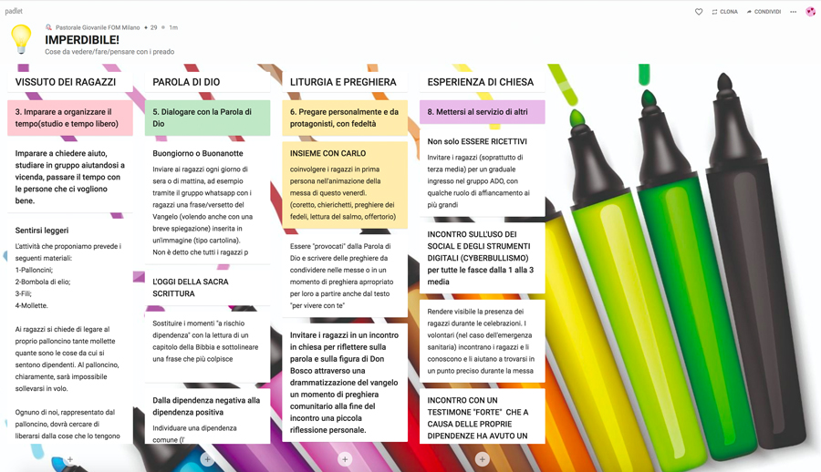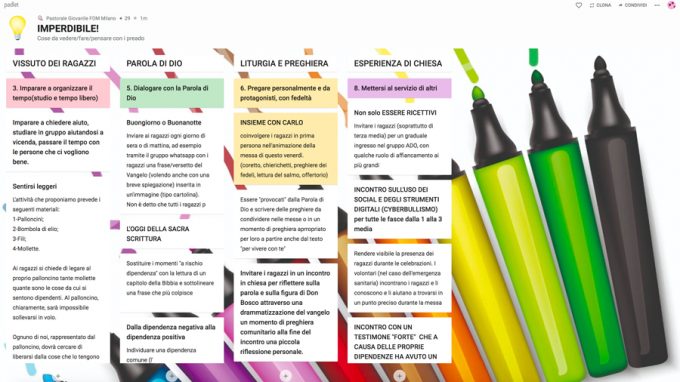Da qui inizia la condivisione e il lavoro di gruppo di équipe che si struttura in due momenti: una parte più riflessiva (tramite la condivisione nell’équipe di educatori preado su alcune domande, che nascono dalla riflessione della professoressa, sul vostro rapporto con loro) e una parte progettuale (realizzare un piccolo progetto, in poche righe, per ideare un’esperienza possibile sulla dinamica delle dipendenze, condividendola tramite un padlet, scegliendo tra le quattro dimensioni fondamentali quella che sentite più vostra: Vissuto dei Ragazzi, Parola di Dio, Liturgia e Preghiera, Esperienza di Chiesa).