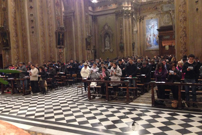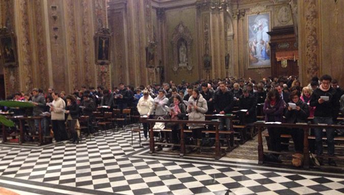 Erano 400 anche i giovani presenti alla prima serata di esercizi nella chiesa dei Santi Apostoli Pietro e Paolo a Lissone (Zona di Monza), con don Maurizio Tremolada: «Quando i conti non tornano nella nostra vita, quando la nostra storia sembra scritta male, come reagiamo? Crediamo che con il suo entrare nella storia, nella storia di ciascuno di noi, Gesù è capace di darle un senso, di scrivere dritto sulle righe storte, di renderci figli in Lui Figlio Unigenito del Padre?».