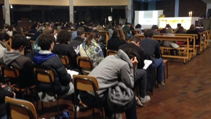 A Varese, nella chiesa di San Massimiliano Kolbe, oltre 300 giovani hanno ascoltato la prima meditazione di don Enrico Parazzoli: «Dio sorprende e “spiazza”, perché non segue strade prevedibili. Dio percorre la strada della nostra debolezza, della nostra storia senza apparenze e senza splendore, perché proprio nel cuore di ogni debolezza – là dove prima o poi ognuno arriva – si trovi non la disperazione, ma il suo Nome e il suo mistero. Un mistero di tenerezza e di accettazione, un mistero di amore fatto carne».