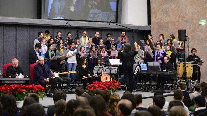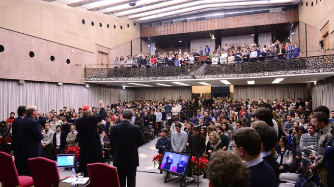 La serata è stata condotta da don Bortolo Uberti, cappellano dell’Università Statale e Bicocca, ed è stata introdotta da monsignor Pierantonio Tremolada, vicario episcopale per l’Evangelizzazione e i Sacramenti. Dopo una scheda filmata di Annamaria Braccini sulla realtà universitaria milanese (9 atenei e 37 residenze cattoliche in totale, per oltre 200 mila studenti), il giovane Lorenzo ha posto all’Arcivescovo una prima domanda su come possiamo incontrare Gesù e passare a una fede adulta, per evitare «più che un cammino, un vagabondaggio». Il cardinale Scola ha così richiamato come sia l’incontro con Qualcuno a mettere nelle condizioni di camminare verso una meta, arrivando a citare il testo di una canzone di Jovanotti («me l’ha passato un prete qualche giorno fa durante un incontro, sono molto amico di suo padre…»): «Ho questo vuoto tra lo stomaco e la gola / voragine incolmabile / tensione evolutiva / nessuno si disseta ingoiando la saliva / ci vuole pioggia, vento e sangue nelle vene / e una ragione per vivere». Con una annotazione: «L’aggettivo non mi piace mica tanto, però la parola “tensione” è spettacolosa».