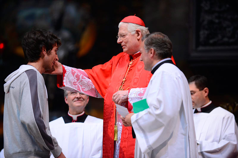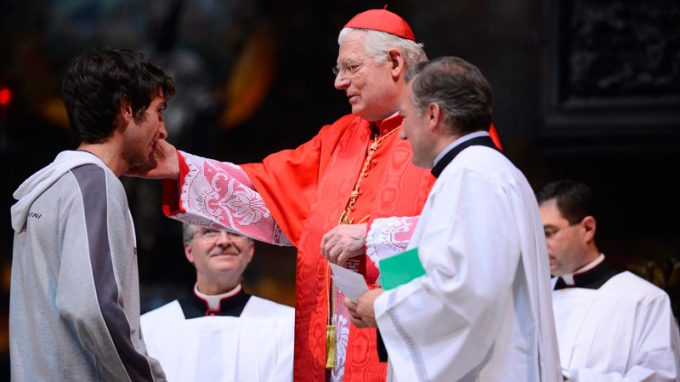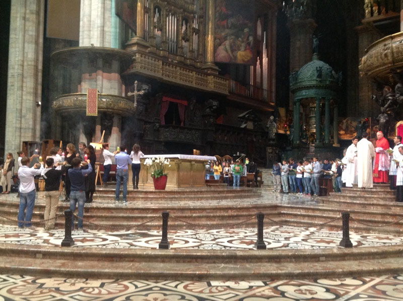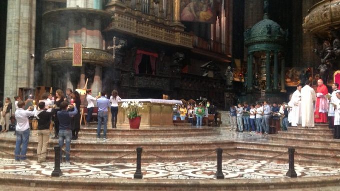 È la cornice che accompagna i ragazzi verso la prima navata: riconoscere che il seme è buono: lo comprendiamo possibile grazie alla nostra fede, alla fede dei santi e dei nostri padri, spiega Scola. Per poi aggiungere che allora “non guardiamo più al futuro smarriti, ma nell’abbraccio della definitività di Dio”. L’ha detto anche Papa Francesco ad Assisi, proprio oggi, ricorda l’arcivescovo: il rapporto con Gesù deve essere un rapporto vitale con la sua persona. “Dobbiamo – spiega Scola citando il pontefice – lasciarci guardare da Lui crocifisso. Una croce il cui messaggio finale è l’amore, la vita donata”.