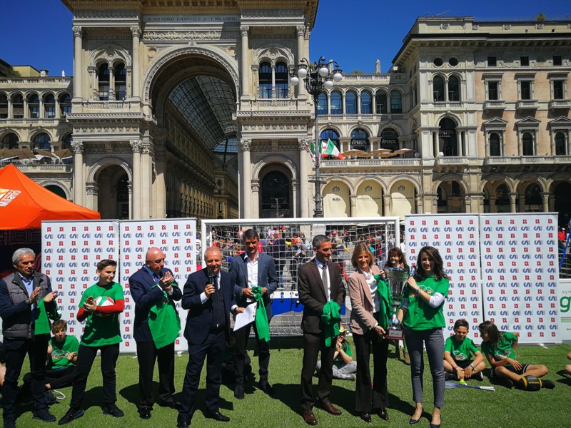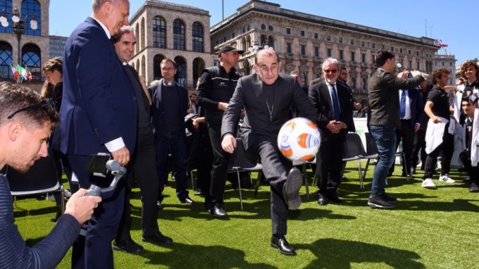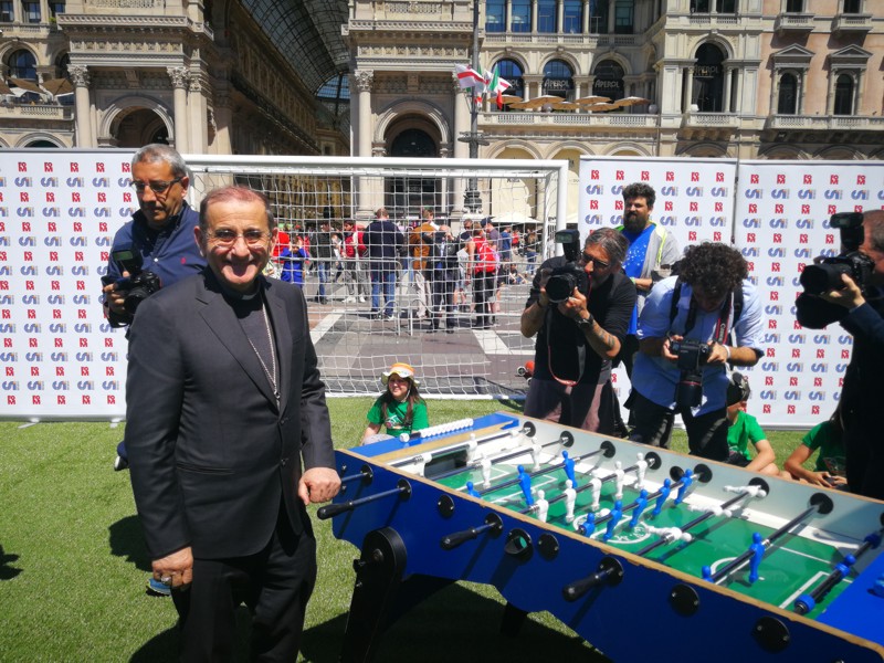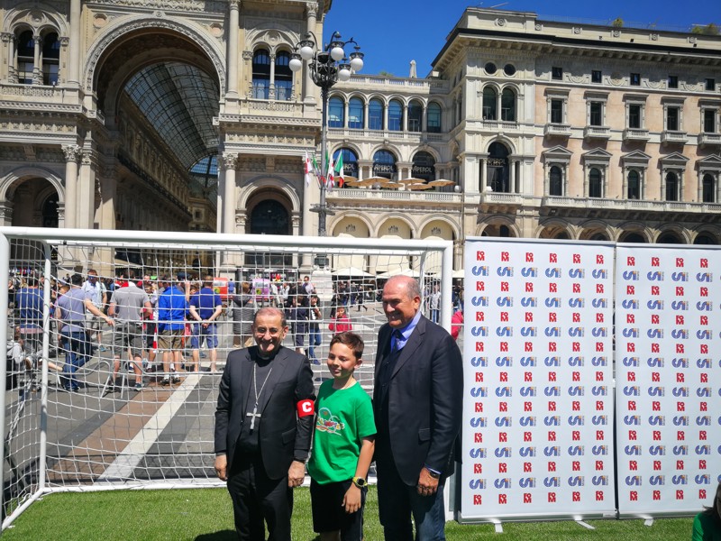 «Lo Sport ci rimanda a un’esperienza fondamentale per la vita dei nostri ragazzi», così l’Arcivescovo di Milano, mons. Mario Delpini, ha dato avvio alla conferenza, durante la quale alcuni ragazzi hanno consegnato la fascia di “capitano degli oratori“. Ora che la grande squadra dei ragazzi dei 1000 oratori ambrosiani ha ufficialmente il suo “capitano”, si inizia a giocare sul serio e, per l’occasione della presentazione di Oralimpics 2019, lo si fa in un campo speciale, nel campo da calcetto allestito nella suggestiva cornice di Piazza Duomo, dove i ragazzi hanno potuto sfidare i grandi campioni, riproducendo l’atmosfera tipica dei nostri oratori… È così che davanti alla Cattedrale è andata in scena una speciale sfida a rigori, tra l’Arcivescovo, alcuni ragazzi e rappresentanti delle società sportive, scatenando il tripudio generale ad ogni gol.