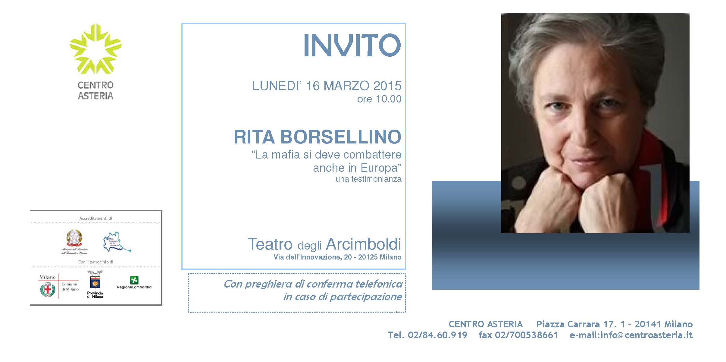 Lunedì 16 marzo, alle 10, al Teatro degli Arcimboldi (viale dell’Innovazione 20, Milano), nell’ambito del progetto culturale/educativo “Il silenzio e la parola”, il Centro Asteria propone un incontro-testimonianza sulla lotta contro la mafia con Rita Borsellino.