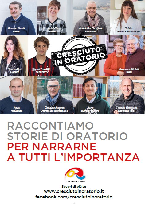 I calciatori Beppe Bergomi e Manuel Locatelli, la cantante Bianca Atzei, il tennista Corrado Barazzutti, l’attore Giacomo Poretti, il cantautore Davide Van De Sfroos, sono i volti dell’iniziativa CRESCIUTOINORATORIO. Ma anche Chiara Alberti, 36 anni, tecnico per la sicurezza sul lavoro, con un figlio di 3 anni e una bimba di 3 mesi; Giuseppe Gorini, 42 anni, imprenditore agricolo con una laurea in scienze agrarie; Jaime Vaca Rodas, 23 anni, milanese di origine boliviana laureato in Scienze dei beni culturali; Gabriella Ciceri, 44 anni, impiegata in un ufficio commerciale; Rosanna e Michele Rizza, impiegati all’Agenzia delle entrate ora in pensione, membri dell’associazione nonni 2.0 e nonni di 24 nipoti.