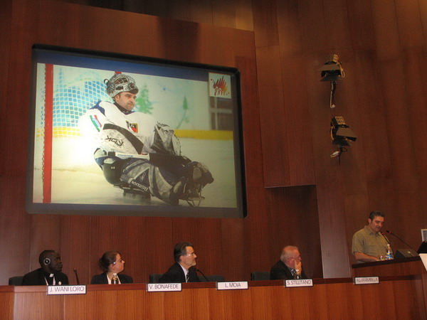 Il campione Santino Stillitano, affetto da agenesia della gamba destra, ha raccontato come si possa comunque arrivare ai vertici sportivi. Portiere della Nazionale di ice sledge hockey, campione alle Paralimpiadi di Vancouver 2007, si sta preparando ai Mondiali 2012. «Mi sento una persona completamente realizzata, perché sono riuscito a trovare nello sport e nella famiglia (ha tre figli, ndr), lo spazio in cui esprimere la ricchezza del dono della vita. Qualcuno ci chiama campioni della vita, ma i limiti fisici non ci impediscono di esprimerci come persone».