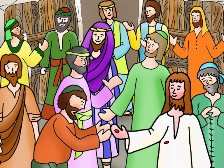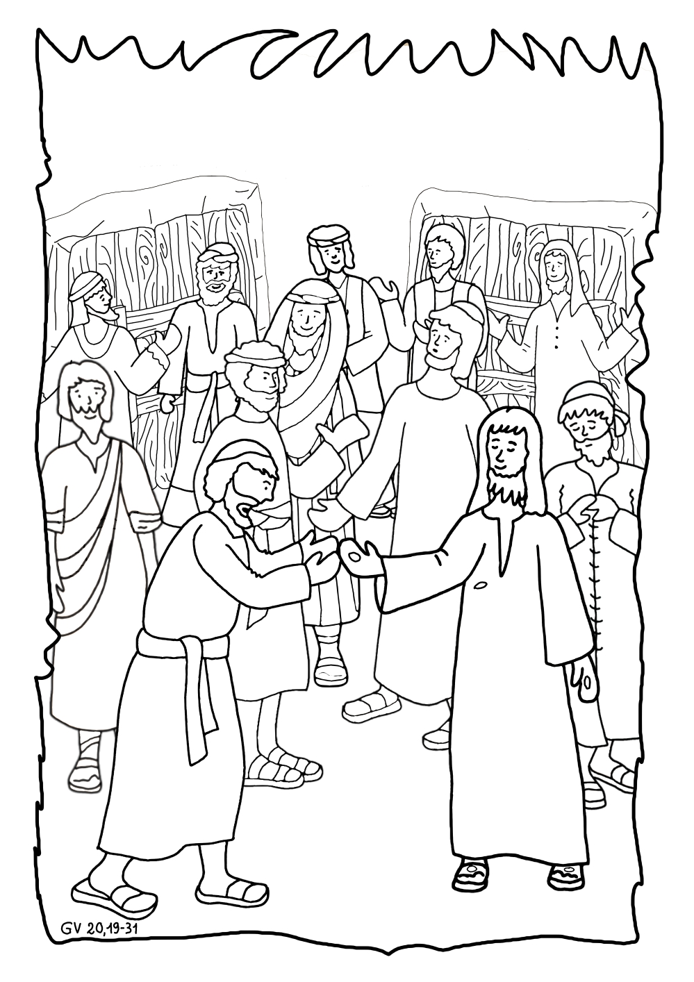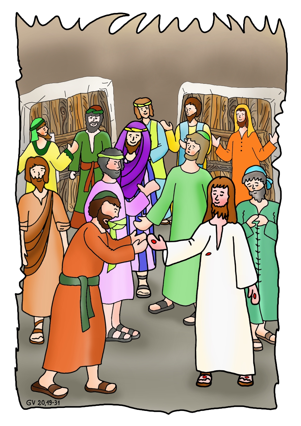 Seconda domenica di Pasqua, Gesù risorto appare ai discepoli e mostra le ferite dei chiodi e tutti sono contenti, Gesù dice loro :” Pace a voi! Ricevete lo Spirito Santo”. Tommaso, non è con loro e quando torna i discepoli lo informano del grande momento che hanno vissuto con Gesù risorto ma… Tommaso non riesce a credere che i suoi fratelli hanno visto Gesù vivo e vero. Otto giorni dopo, mentre tutti sono in casa, arriva Gesù a porte chiuse, poi si rivolge a Tommaso e le mostra le mani e il fianco trafitto. Tommaso esclama:” Mio Signore e mio Dio!” e Gesù raccomanda a tutti e anche a noi di credere in Lui anche se non lo vediamo perché Gesù è sempre vicino a noi!