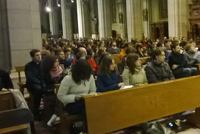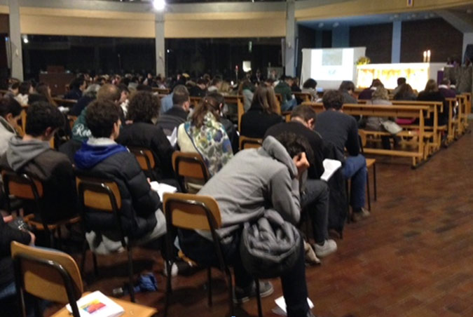 Erano 400 anche i giovani presenti alla prima serata di esercizi nella chiesa dei Santi Apostoli Pietro e Paolo a Lissone (Zona di Monza), con don Maurizio Tremolada: «Quando i conti non tornano nella nostra vita, quando la nostra storia sembra scritta male, come reagiamo? Crediamo che con il suo entrare nella storia, nella storia di ciascuno di noi, Gesù è capace di darle un senso, di scrivere dritto sulle righe storte, di renderci figli in Lui Figlio Unigenito del Padre?».