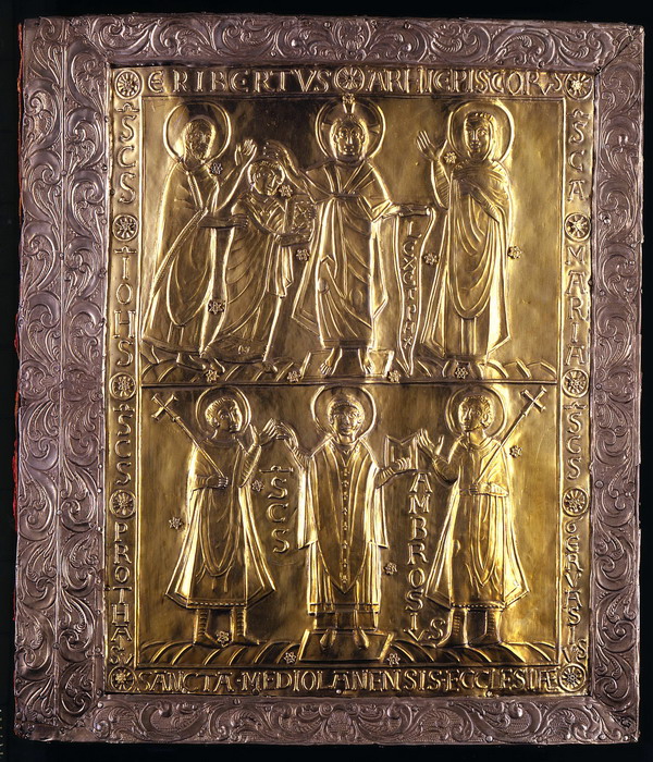 La mostra di Palazzo Reale, tuttavia, riserva anche altre eccezionali proposte ai visitatori. Come l’Evangeliario di Ariberto, la cui sontuosa coperta rappresenta il più importante esempio di oreficeria romanica in Lombardia (come è già stato ricordato su queste pagine nelle scorse settimane). O come l’Evangeliario custodito presso la Biblioteca Capitolare di Busto Arsizio dal 1625, ma databile alla seconda metà del IX secolo, quando venne probabilmente composto per l’antichissima chiesa di Olgiate Olona: redatto su pergamena in bella scrittura minuscola carolina, questo codice contiene circa 180 brani evangelici e presenta un indice con la sequenza della letture attribuite a ciascuna festività dell’anno liturgico.