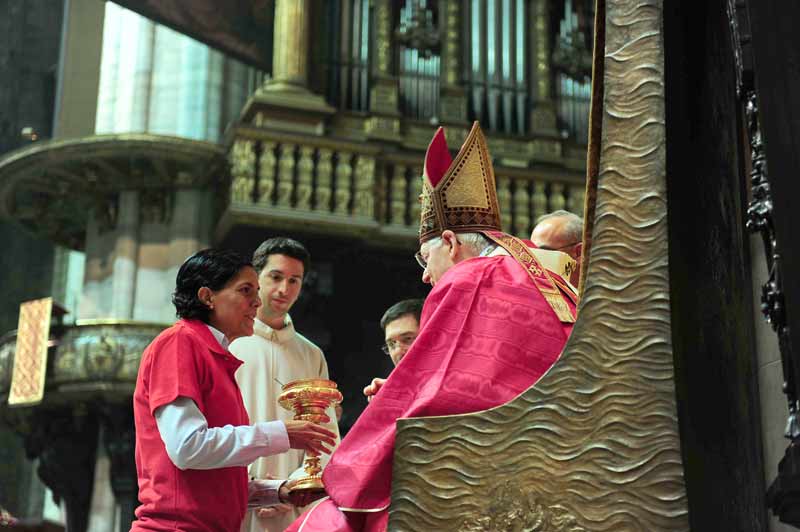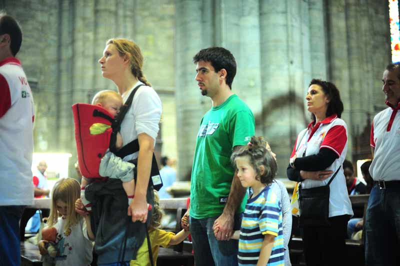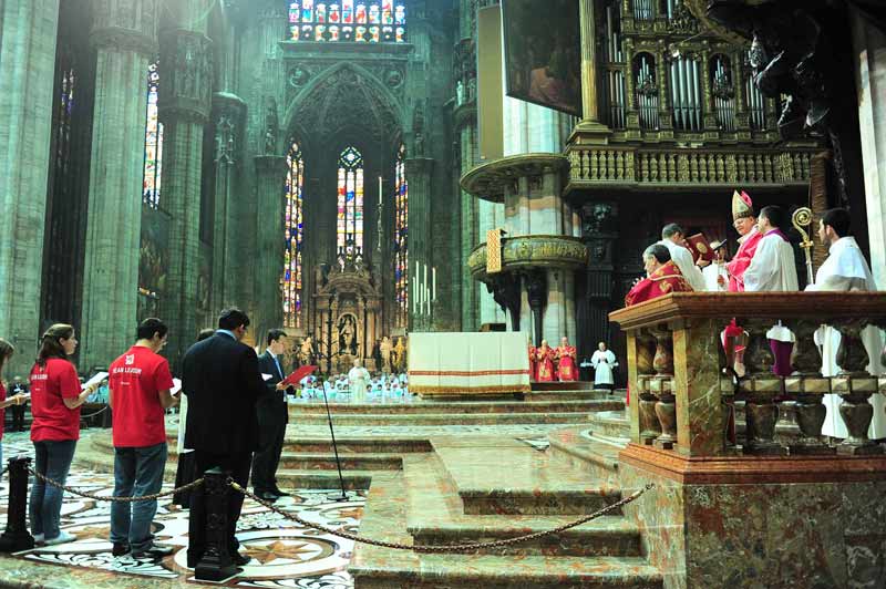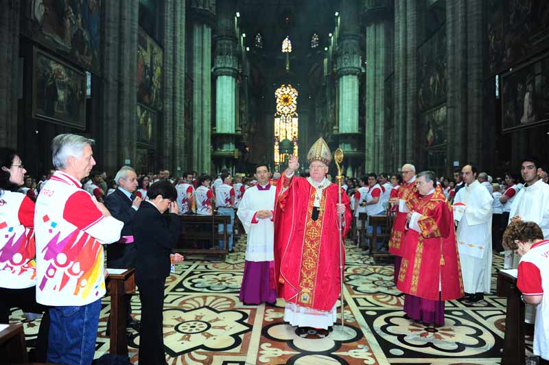Duomo di Milano gremito per la consegna del mandato ai volontari del VII Incontro internazionale delle famiglie. Ragazzi e ragazze giovani, ma anche adulti e anziani. Tutti con indosso la polo bianca e rossa con il simbolo stilizzato della cattedrale. Un colpo d’occhio di grande effetto tra le navate della cattedrale, in cui ha risuonato per la prima volta l’inno ufficiale di Family 2012.