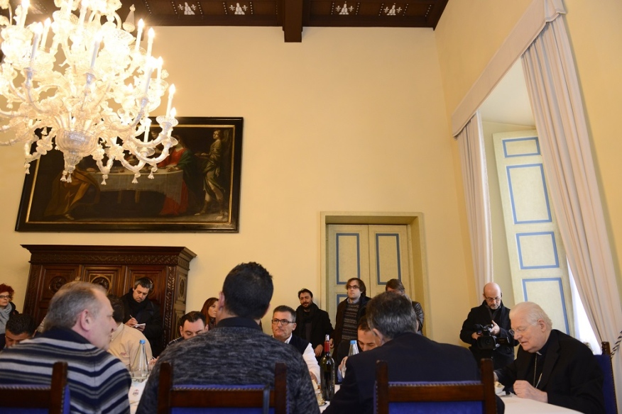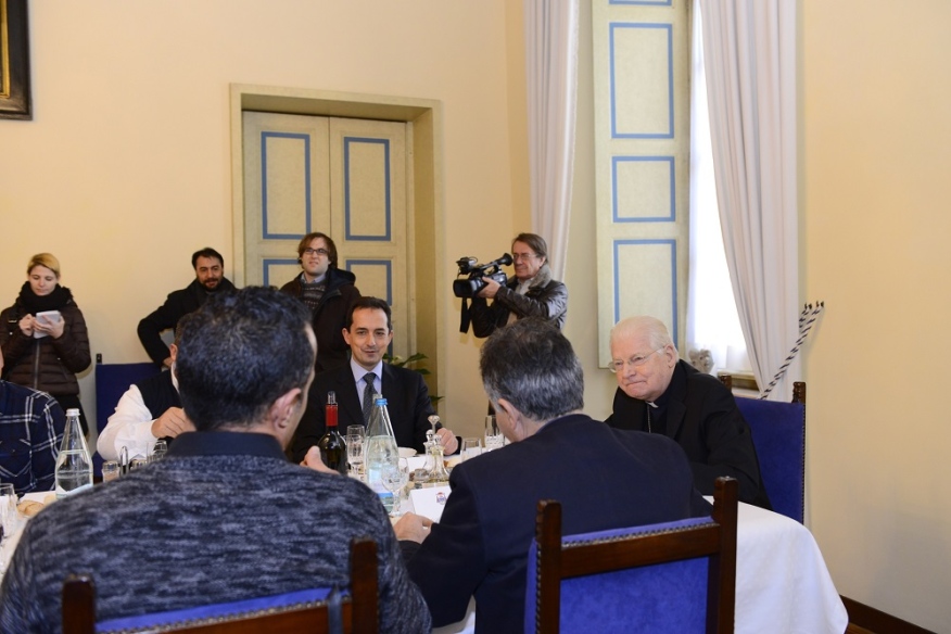 Arrivano, portando il loro dono, un presepe di tipo napoletano da loro realizzato, che viene posto nella sala dove, poco dopo, si riuniscono per il pranzo con il cardinale Scola.