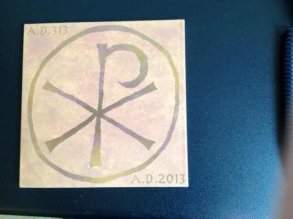 La formella reca le due date – 313 (anno dell’Editto) e 2013 – e il simbolo del krismòn, composto dalle due lettere chi e ro che simboleggiano il nome di Cristo e formano il segno grafico della croce: come riferisce Eusebio, si tratta dell’emblema che Costantino adottò in occasione della battaglia del ponte Milvio a Roma nel 312 e che si diffuse dopo l’Editto di Milano. L’immagine è già stata utilizzata per il timbro dell’annullo postale realizzato il 15 maggio in occasione della Lectio magistralis tenuta dal cardinale Angelo Scola e dal patriarca Bartolomeo I a Palazzo Reale. L’esposizione curata dal Museo Diocesano nella stessa sede ne ha presentati molti esempi, provenienti da diversi Paesi europei.