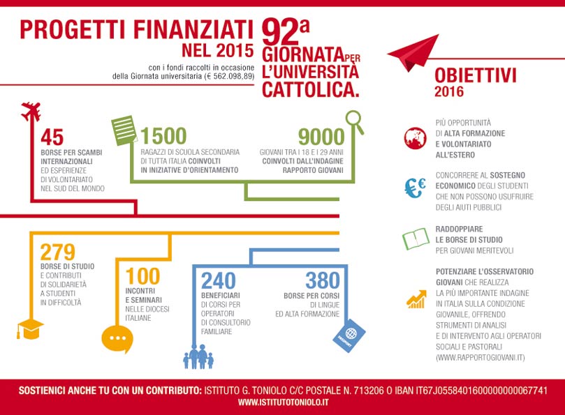 Nel 2016, oltre a confermare il sostegno agli studenti meritevoli dell’Ateneo e alle attività già avviate, in vista del concorso nazionale che si terrà in 11 città italiane il 28 maggio, l’Istituto di Studi Superiori Giuseppe Toniolo, ente fondatore dell’ateneo, intende raddoppiare le borse di studio per giovani meritevoli iscritti; concorrere, con l’Università Cattolica ed Educatt, al sostegno economico degli studenti; costituire un Osservatorio permanente sulla condizione giovanile in Italia che offra strumenti di analisi e di intervento agli operatori sociali e pastorali.