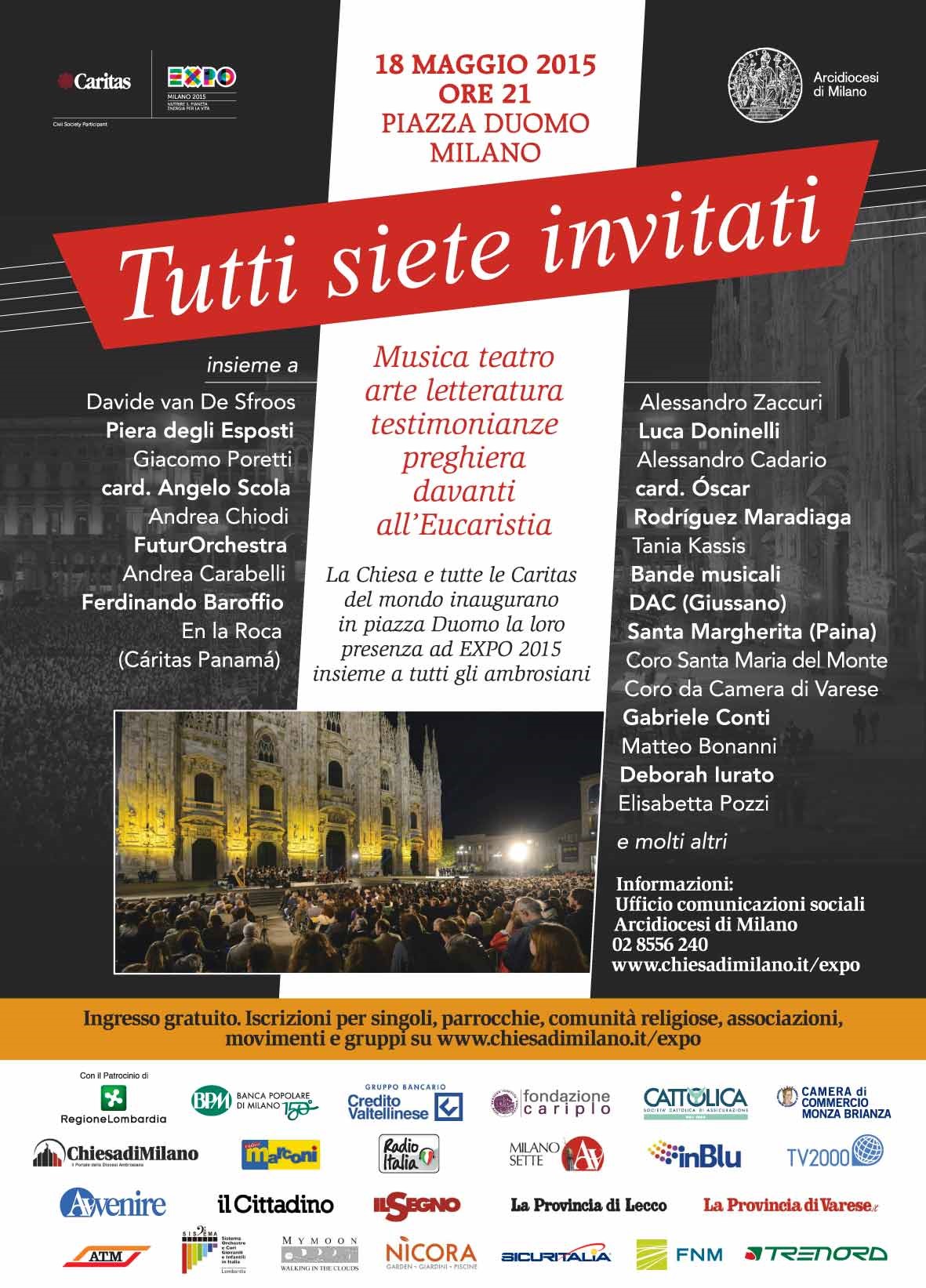La serata (diretta su Tv2000, Radio InBlu, Radio Marconi, Radio Mater e Chiesadimilano.it) si aprirà con la testimonianza del cardinale Óscar Rodríguez Maradiaga, presidente di Caritas Internationalis, e si concluderà con la riflessione del cardinale Angelo Scola, Arcivescovo di Milano. Ma «Tutti siete invitati» sarà anche una grande serata di cultura, teatro e musica, con la presenza di nomi di prestigio e di una grande orchestra, la Futurorchestra. Tra gli artisti che hanno già confermato la loro presenza, Giacomo Poretti, Piera Degli Esposti, Davide van De Sfroos, Tania Kassis, Luca Doninelli, Andrea Chiodi, Alessandro Cadario, Alessandro Zaccuri, Ferdinando Baroffio, Deborah Lurato, Carlo Pastori, attore e musicista, il coro di Santa Maria del Monte e il coro da camera di Varese, il gruppo panamense En la Roca e le bande musicali DAC di Giussano e Santa Margherita di Paina.