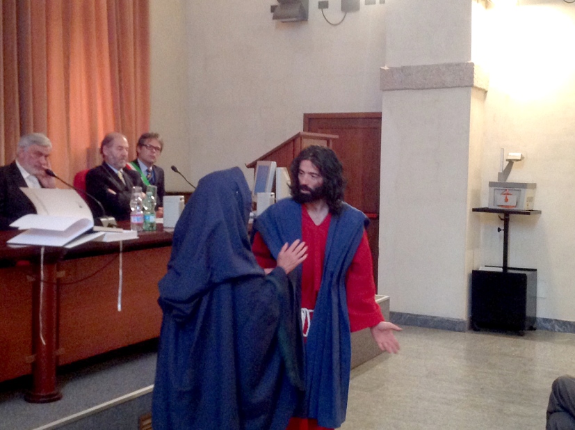 Apre l’incontro monsignor Mario Delpini, il Vicario generale, che dice: «In un momento in cui Milano sembra essere il centro del mondo, presentare questa sacra rappresentazione ci è parso rilevante e abbiamo subito aderito con piacere. Rappresentare la morte in croce di Gesù, significa indicare che questa memoria non si può solo raccontare come un’opera d’arte, ma la sua natura chiede di divenire un evento, ogni volta che vi si pensa. Il fatto che gli abitanti del paese siano tutti coinvolti, mi pare che dica una verità profonda del mistero che celebriamo nell’Eucaristia, ossia che non è possibile rimanere unicamente a guardare, ma occorre giocarsi in prima persona, parlando non solo di ciò che è avvenuto, ma dicendo anche qualcosa di sé. Il risultato corale dell’iniziativa, significa che l’incarnazione popolare della Passione muove la coscienza e le relazioni. E questo, come cristiani, è fondamentale».