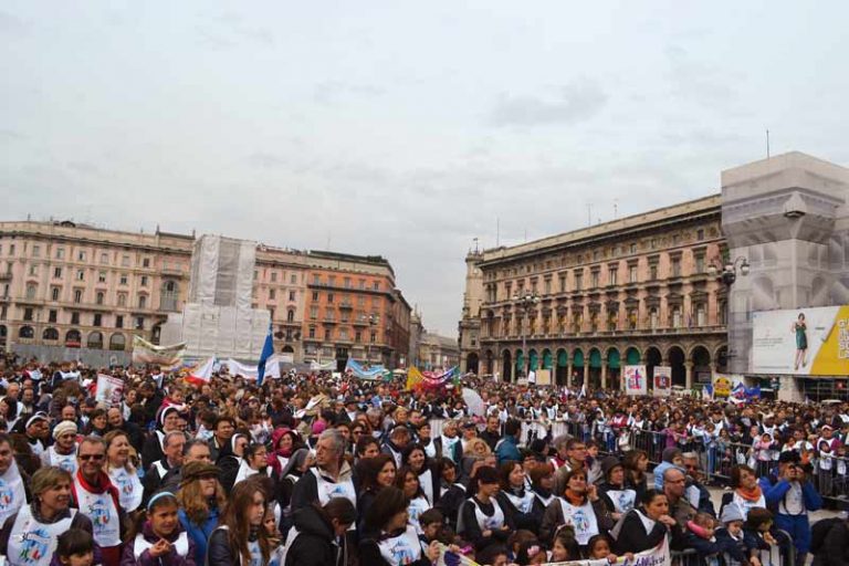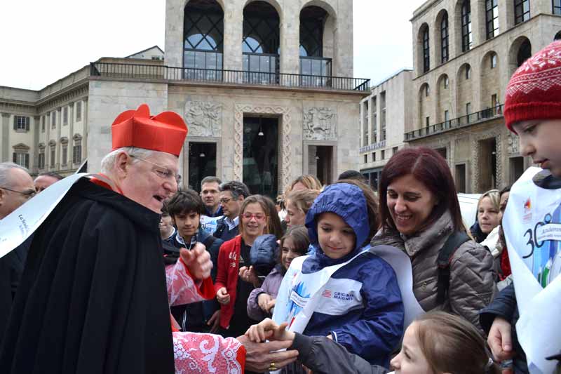 Istituzioni e famiglie si sono ritrovati in piazza Duomo per promuovere insieme la scuola cattolica italiana e per ribadire ancora una volta l’importanza dell’educazione sia per i giovani sia per l’intera società. Anche il Cardinale Angelo Scola, che per la prima volta ha partecipato alla manifestazione in veste di Arcivescovo della Diocesi di Milano, ha voluto sottolineare il valore che un’educazione libera e senza pregiudizi ha per la vita dei più piccoli e per lo sviluppo dell’intero paese. «La mancanza di libertà di educazione è una ferita gravissima per la società civile e questo dobbiamo dirlo a grandissima voce. Sono convinto che questa libertà sia uno dei diritti che un paese che vuole guardare al futuro dovrà riconoscere. Ci sarà progresso, futuro, innovazione, cultura e il così chiamato capitale umano e sociale senza educazione? No, l’educazione è la chiave del progresso», ha affermato il Cardinal Scola rispondendo ad alcune domande che gli sono state poste da alcuni ragazzi delle scuole paritarie cattoliche presenti in piazza. L’Arcivescovo ha infatti scelto per l’occasione di non tenere un’omelia, ma di conversare direttamente con i giovani, sia di argomenti leggeri come il suo primo giorno di scuola, sia di argomenti più seri come i tanti pregiudizi che circondano le scuole paritarie cattoliche. «Il compito di sfatare i pregiudizi tocca a noi – ha detto il Cardinale Angelo Scola -. Se io sono oggetto di un pregiudizio, con molta serenità, se sono convinto della mia identità e di ciò che porto, troverò la strada per parlare, per dialogare, per sfatare il pregiudizio. Io sono convinto che la scuola cattolica come parte della scuola libera è un elemento di grande civiltà per il nostro Paese».