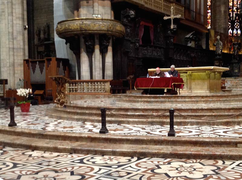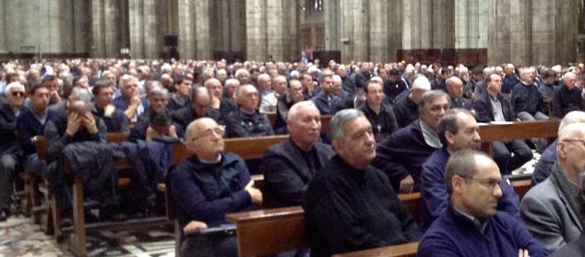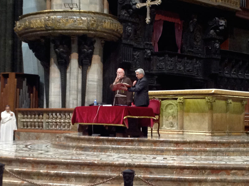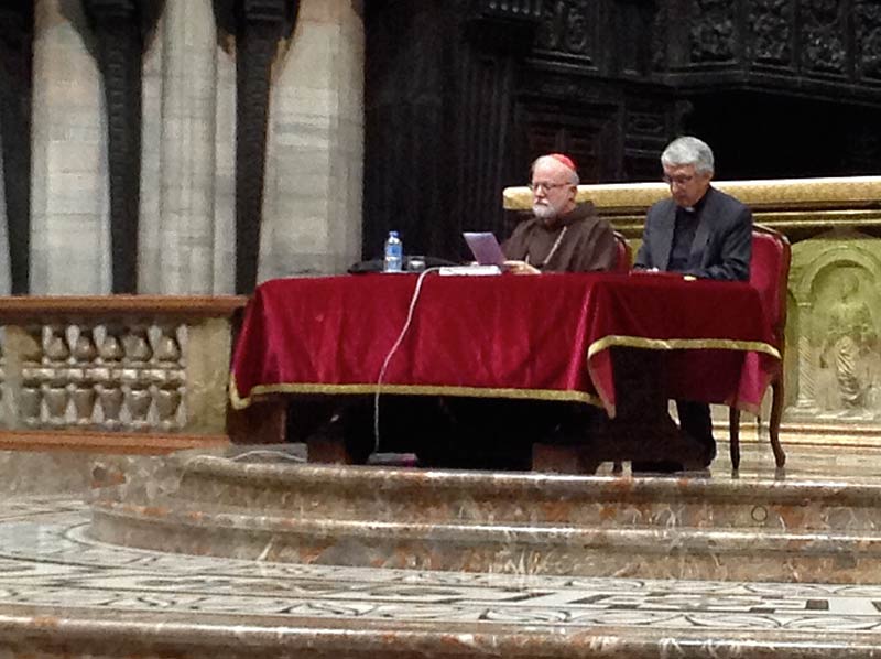 I preti ambrosiani, giunti in grandissimo numero per ascoltare il Cardinale – accanto a lui sull’altare maggiore è il vicario episcopale monsignor Luca Bressan – seguono attenti l’intervento, prendono appunti, scambiano qualche opinione tra loro: si capisce subito che si è creata sintonia con O’Malley, che prende la parola dopo la lettura, da parte del Vicario generale monsignor Mario Delpini, del saluto inviato dal cardinale Scola, impegnato in Vaticano per il Sinodo. Nelle parole dell’Arcivescovo il senso complessivo dell’evento: «Anche quest’anno vogliamo continuare a riflettere sul significato della chiamata all’evangelizzazione nelle città metropolitane, aiutati dal racconto dei pastori di due rilevanti Chiese del mondo; per proseguire poi il nostro percorso approfondendo la proposta delle comunità educanti e la riflessione sul nuovo umanesimo. Molte sono le ragioni per cui l’ascolto del cardinale O’Malley è per noi tutti un eccezionale privilegio. Il suo itinerario personale, come frate cappuccino e sacerdote, lo ha condotto a condividere e a occuparsi delle vicende della popolazione ispanica negli Stati Uniti. Quando il fenomeno migratorio era ancora lontano dal manifestarsi nella nostra società italiana, il Cardinale già lavorava con consistenti comunità di migranti a Washington. Inoltre l’arcidiocesi di Boston è emblematica per la complessità di ricchezze e difficoltà, tipiche delle metropoli contemporanee, e ha dovuto affrontare circostanze assai difficili nei tempi recenti».