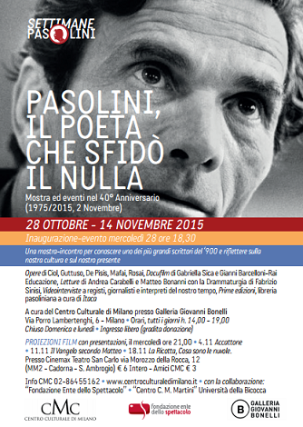 Milano incontra Pier Paolo Pasolini, poeta, intellettuale e regista che, con la sua passione e disperata vitalità, ha vissuto e posto interrogativi autentici sulla realtà sociale, culturale e religiosa del suo tempo, tali da mostrare oggi tutta la sua attualità e profezia. Una mostra-incontro dunque per riscoprire Pasolini e riflettere sulla nostra cultura e sul presente.