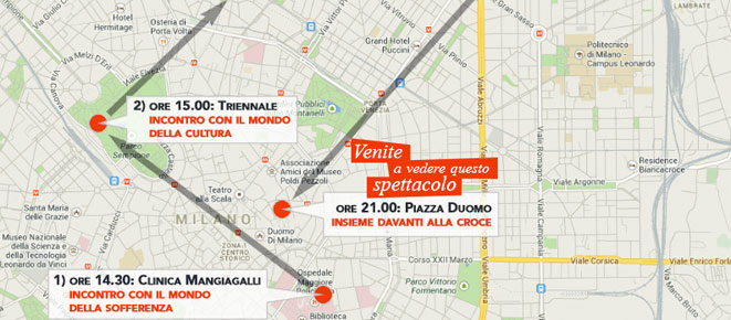 La grande piazza davanti alla Cattedrale – nella quale si attendono 30 mila persone – sarà la tappa finale del pellegrinaggio della croce che inizierà molte ore prima. La Croce sarà portata dall’Arcivescovo fin dalle prime ore del pomeriggio per le strade di Milano, sostando in alcuni punti emblematici della vita quotidiana della città. Qui si svolgeranno dibattiti con i protagonisti di diversi mondi: la Clinica Mangiagalli (incontro con la realtà della sofferenza e in particolare del disagio psichico), la Triennale (cultura), piazza Gae Aulenti (lavoro e economia), la parrocchia di San Giuseppe dei Morenti (via Celentano 14), uno dei quartieri con la maggiore presenza di immigrati, per un dialogo con i rappresentanti della città meticcia.
