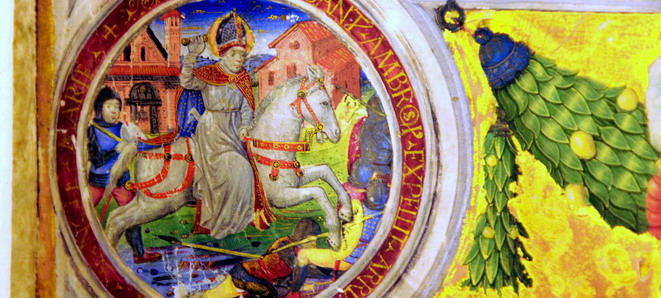 Come si vede nella splendida miniatura di Cristoforo de Predis al Museo Baroffio del Sacro Monte di Varese.L''immagine del santo vescovo milanese che scaccia l'eresia o colpisce i nemici del territorio ambrosiano, infatti, era tra le più diffuse nel Medioevo, ma non piaceva a san Carlo...