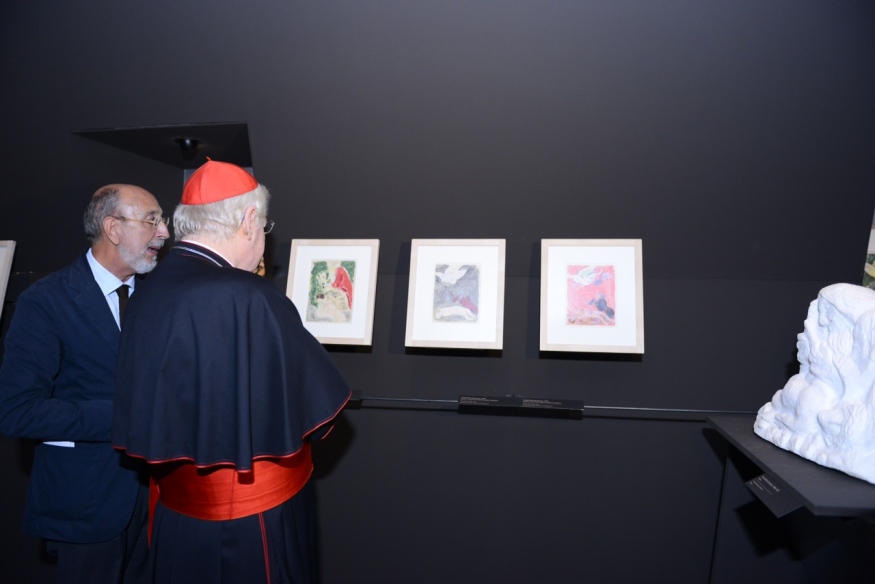 E “Chagall e la Bibbia” – domani a Palazzo Reale si inaugurerà una retrospettiva dedicata allo stesso artista – è davvero un modo per parlare al “cuore” dell’uomo, al suo dolore, ai grandi sentimenti universali con opere in cui egli seppe affrontare alcune questione-chiave con totale libertà di mano e pensiero. Dal tema amatissimo di Giobbe, alla lotta di Giacobbe con l’angelo (splendida l’opera in marmo), alle Crocifissioni, come simbolo della sofferenza, dell’innocenza tradita, della salvezza: tutto parla dell’umanità in queste opere, davanti alle quali il Cardinale si ferma, ammirato, percorrendo il suggestivo allestimento, che sembra aprirsi al cielo, degli architetti Guido Moerpurgo e Annalisa de Curtis. Come, a lungo, si ferma di fronte alla “Crocifissione messicana”, dove una donna in primo piano, che tiene un bimbo in braccio e un crocifisso più piccolo, ma che pare incombere sul destino non è, per definizione emblema mariano, ma simbolo del dolore di ogni madre che piange, ieri come oggi, magari di fronte a un figlio straziato dalle guerre insensate degli adulti.