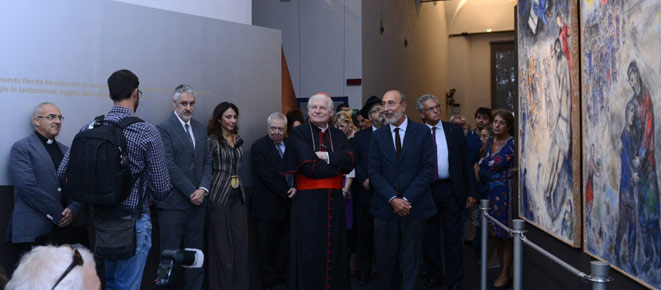 È questo l’augurio rivolto dal cardinale Scola ai moltissimi che, presso il Museo Diocesano, hanno preso parte all’inaugurazione della rassegna chagalliana, che, nel suo prezioso e inedito percorso espositivo, propone sessanta opere con ventidue gouaches preparatorie. Davanti a lui il sindaco Pisapia, il rabbino capo di Milano, rav Arbib, l’Assessore alla Cultura, Del Corno, il Vicario Episcopale monsignor Bressan, il presidente della Fondazione, Pavanello e molte autorità. Il direttore del Museo, Paolo Biscottini, apre l’incontro.
