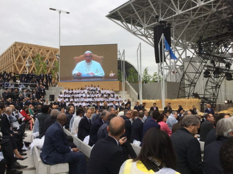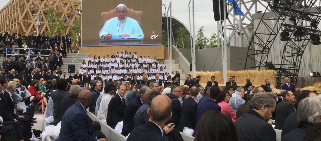 Il Santo Padre ha voluto far arrivare la propria voce ai visitatori dell'Esposizione con un videomessaggio in diretta: «Veri protagonisti dell’evento i volti degli uomini e delle donne che hanno fame». Inaugurato il padiglione della Santa Sede