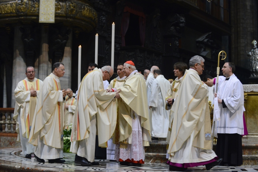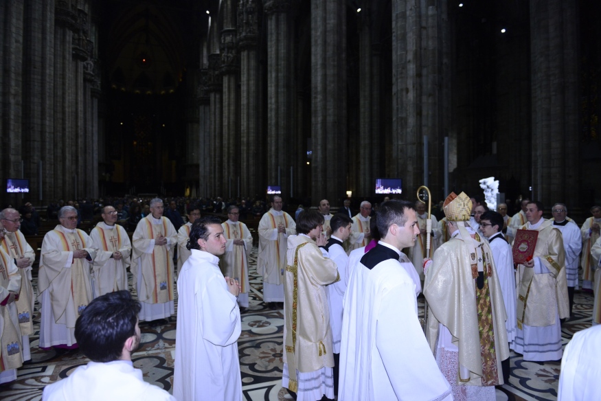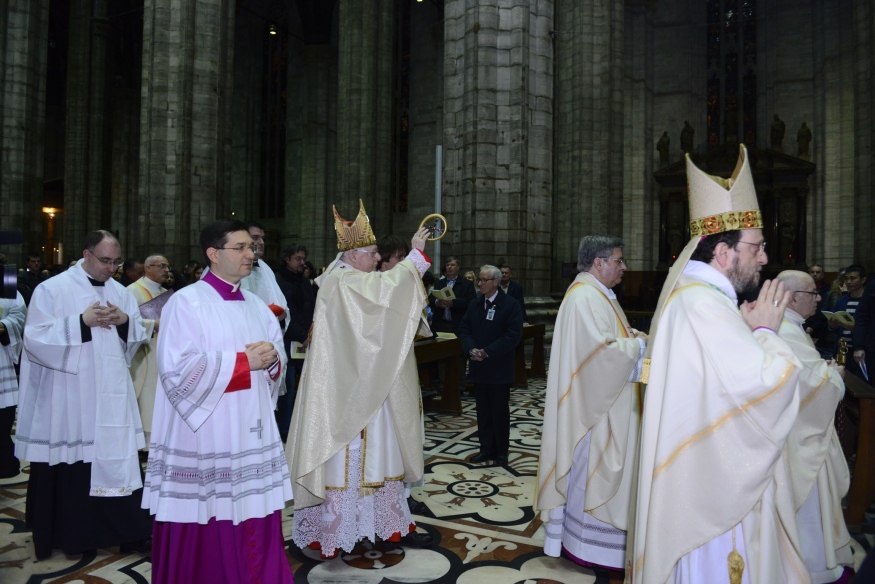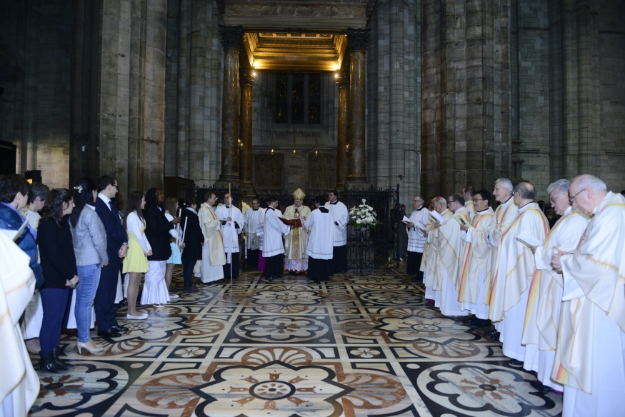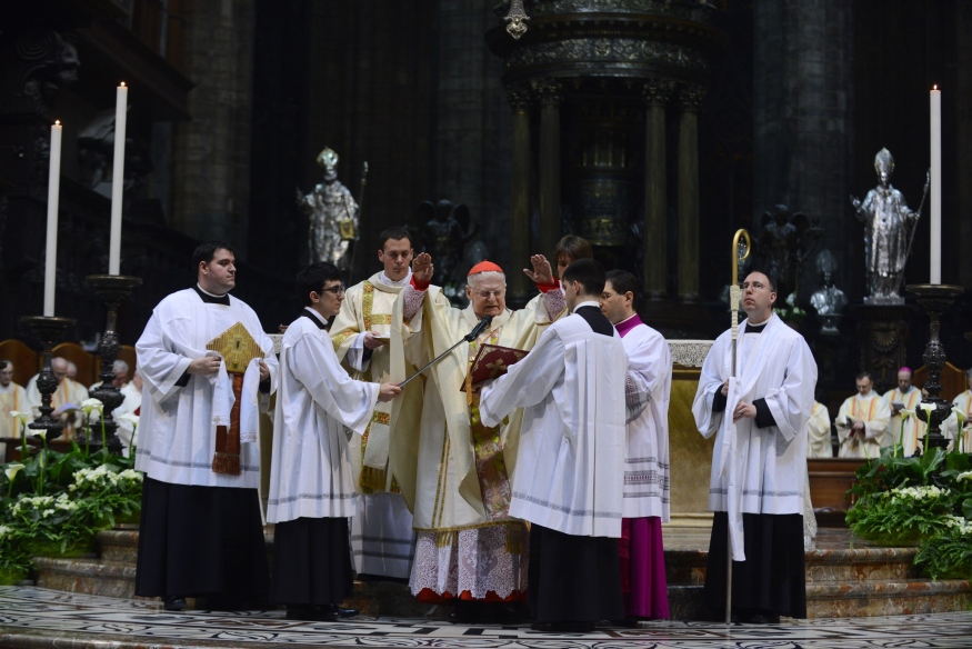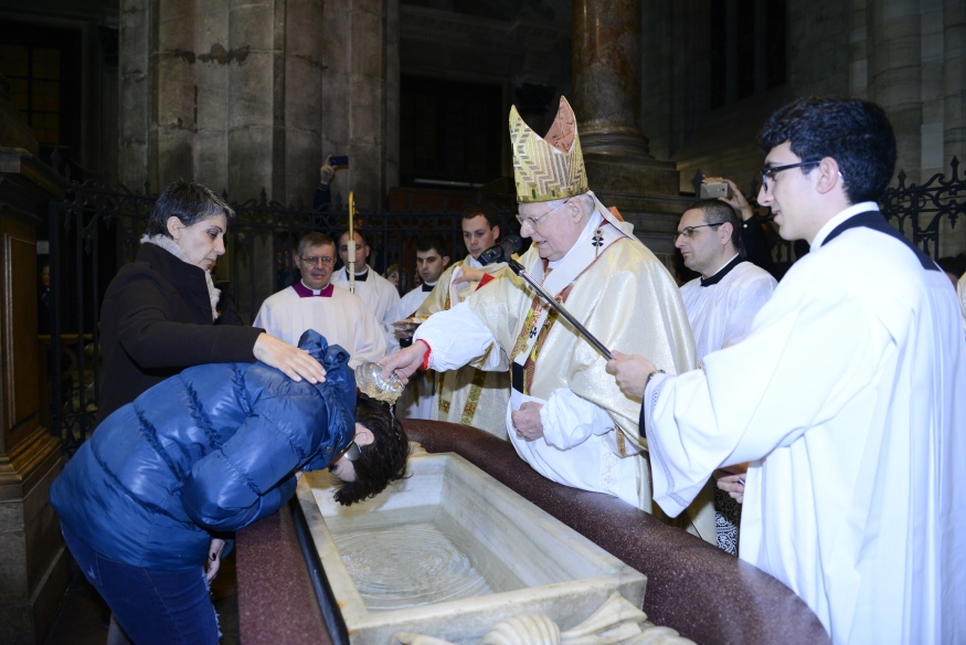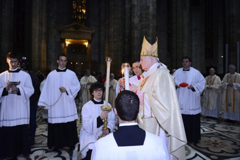 È la Veglia nella Pasqua di Risurrezione del Signore, madre di tutte le Sante veglie, come la definì sant’Agostino, che si apre, presieduta dal cardinale Scola, in Duomo con l’accensione del cero pasquale – simbolo del Risorto – al lume portato dagli otto Catecumeni che, nella Celebrazione, ricevono il Battesimo, la Cresima e la Comunione. Concelebrano il vescovo ausiliare Martinelli e l’intero Capitolo metropolitano. Lo splendido Preconio pasquale, solenne e tipico ambrosiano risalente alla fine del V secolo-inizio del VI, che risuona in latino tra le navate gremite di migliaia di fedeli, è cantato in latino dal diacono, quale sintesi poetica dell’intera storia della salvezza. Nella Cattedrale, prima in ombra, si accendono le luci e guidati dalla straordinaria ricchezza della Parola di Dio, attraverso nove Letture, «si contempla il miracolo, appunto, della perenne novità». L’evento «unico e universale che è Cristo passo, morto e risorto», per usare le parole dello stesso Arcivescovo.