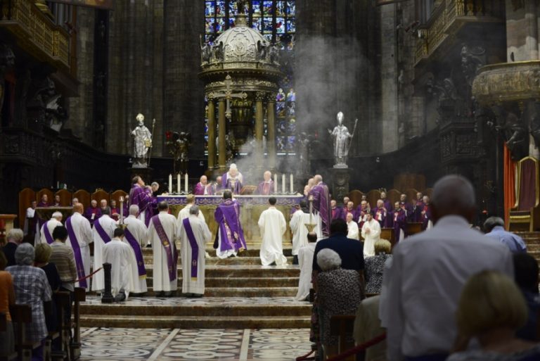 Poi, a conclusione della Messa, la breve processione alla tomba del cardinal Martini, con la benedizione e i tre Cardinali in ginocchio che sostano in silenzio e preghiera attorniati dai Concelebranti e dalla gente, tra cui la sorella che depone un’unica rosa bianca sulla lapide nel pavimento della Cattedrale.