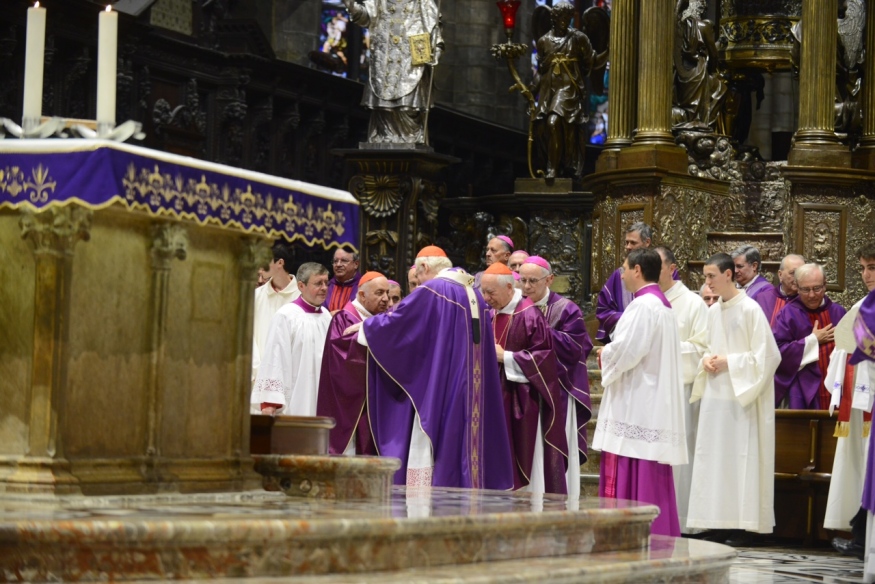 Concelebrano il rito due Cardinali – l’Arcivescovo emerito di Milano, Dionigi Tettamanzi, successore diretto di Martini e il presidente del Pontificio Consiglio per i Testi Liturgici, Francesco Coccopalmerio -, i Vescovi ausiliari (cui si aggiunge monsignor Renato Corti, già vescovo di Novara e per un decennio vicario generale di Martini), il Consiglio Episcopale Milanese, il Capitolo Metropolitano e un centinaio di sacerdoti, tra cui il presidente e il vicepresidente della Fondazione Martini, i gesuiti, padri Casalone e Costa. Non mancano la sorella signora Maris, il nipote Giovanni Martini e altri congiunti e amici.