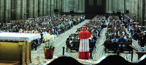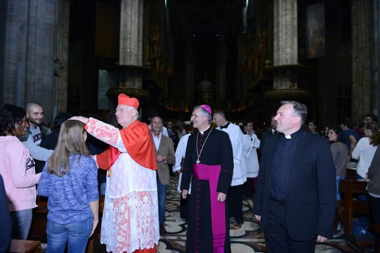 Infine, il silenzio raccolto, la consegna della “Regola” nelle mani del Cardinale e degli Ausiliari, la preghiera della “Redditio” del cardinale Martini, la lettura di piccoli, ma assai significativi brani tratti dalle “Regole di Vita” dei 19enni, le Esortazioni di Greta, educatore del “gruppo Samuele” che ne narra la sua felice esperienza e, ancora, di Peter. E c’è ancora tempo, mentre i grandi portali del Duomo si aprono, per i ringraziamenti di don Marurizio Tremolada e di monsignor Pierantonio Tremolada che raccomanda la lettura del testo “Linee di pastorale giovanile” «a disposizione da stasera sul sito della Diocesi», e che comunica ai giovani che, per Expo, «sarete invitati a offrire la vostra disponibilità come volontari». Il pensiero è anche per le cappellanie universitarie – in rete con il sito e il giornale “Universi” – con il loro ruolo fondamentale.