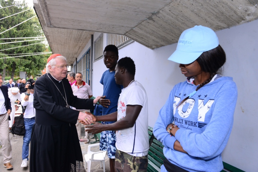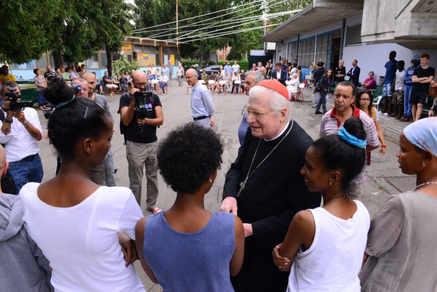 I giochi, la piccola giostra tra gli alberi, i panni stesi, donne che parlano tranquille con i loro bimbi in braccio, qualche anziano che cammina lentamente. Insomma, un pomeriggio normale nella tranquillità di una periferia urbana estiva e circondata da palazzoni, se non fosse che, nei grandi spazi dell’oratorio della parrocchia Beata Vergine Assunta in Bruzzano, quelle mamme e quei bimbi, quei ragazzi sono profughi. Accolti, e “adottati” non solo dai volontari, dalla gente, ma anche dal quartiere.. E, allora, per dire «il suo personale grazie di cuore», arriva il cardinale Scola, che incontra gli ospiti, dialoga, si raccoglie in silenzio, ascolta le loro storie in questo angolo della periferia nord di Milano, dove è in fase conclusiva il progetto di accoglienza estiva, iniziato il 22 luglio. Oltre 100 le persone – soprattutto di origine eritrea, etiope, somala – alle quali sono state aperte le porte ogni giorno per un totale di 365 uomini e donne di 13 nazionalità diverse: tante le giovani coppie, ma anche le donne sole con bimbi.
