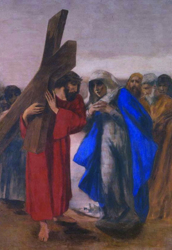 Passo, sguardo, gesto di Maria, ma anche della Chiesa chiamata sulla stessa via dolorosa ad accompagnare, riconoscere, contemplare il suo Redentore. E Gesù risponde volgendosi verso la madre e spingendo il capo il più vicino possibile a lei: socchiude gli occhi in un delicato, sereno e quasi tenero consenso e sembra suggerirle una segreta parola che non è di semplice consolazione, ma gia annuncio di vita. Un segreto profetico suggellato dal suo stesso gesto. Cristo, certo, porta la croce, che sembra farsi improvvisamente leggera, ma soprattutto, con la mano sinistra, la indica chiaramente a tutti come unico e vero strumento di salvezza: «Chi vuol venire dietro a me, rinneghi se stesso prenda la sua croce e mi segua. Perché chi vuole salvare la propria vita, la perderà, ma chi perderà la propria vita per causa mia, la troverà».