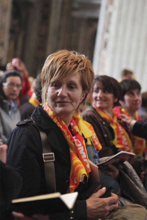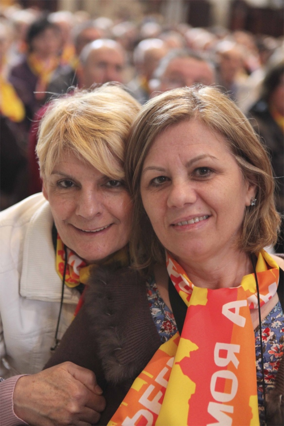 Sentimenti condivisi, alcune panche più indietro, da Bianca Campus e Maria Invanova, di Vaprio d’Adda. Siedono tra i 200 pellegrini del Decanato di Trezzo, dimostrando, con i foulards giallo e rossi e il simbolo di un Duomo stilizzato stretto nella mano, una vivacità tutta ambrosiana. «Non abbiamo quasi dormito – aggiunge una giovane vicina -, ma il sacrificio viene ripagato da questo momento: ho voluto esserci a tutti i costi, così come l’anno scorso ho partecipato a Bresso alla Festa delle Testimonianze e alla Messa con Papa Benedetto. E domani, poi, vedrò finalmente Papa Francesco!».