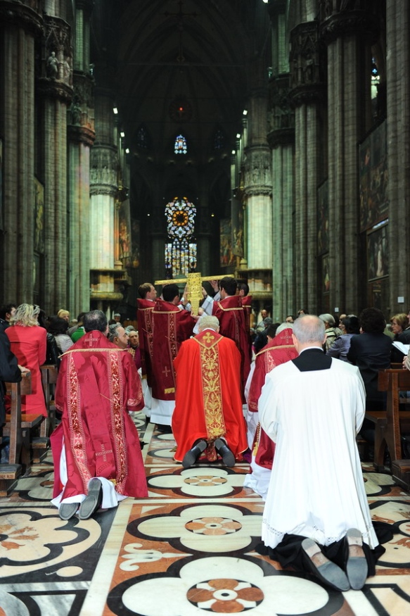 Il Venerdì santo, nella tradizione ambrosiana, è giorno strettamente aliturgico (in Duomo inizia alle 8.15, con l’Ufficio delle Letture, Lodi e Ora Terza, presieduto dall’Arcivescovo): non solo infatti non si celebra la Messa, ma, a differenza del rito romano, neppure viene distribuita la Comunione eucaristica, per sottolineare che l’atto celebrativo con cui si compie la memoria liturgica della morte del Signore è proprio la solenne proclamazione della sua Passione.