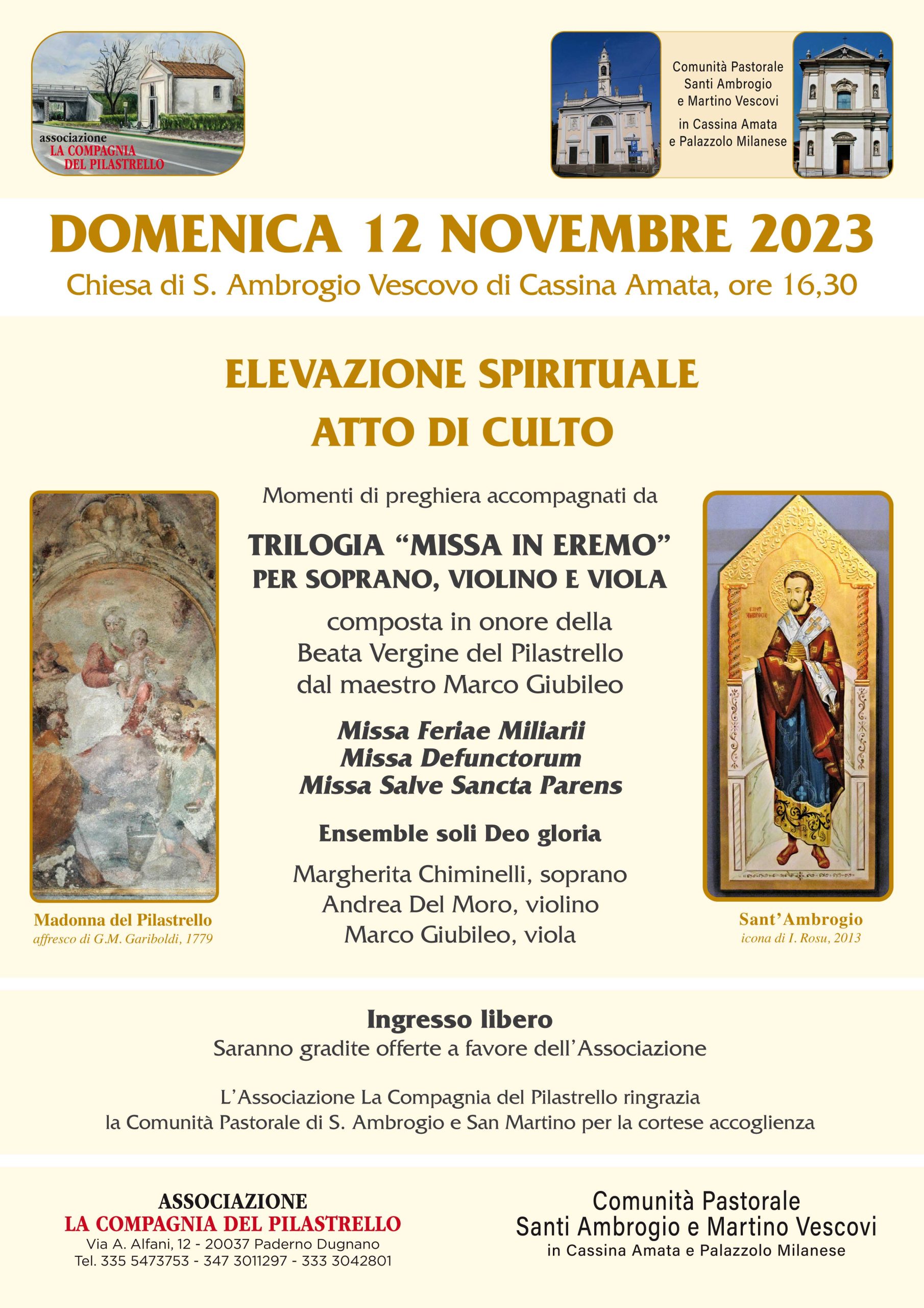 Il 12 novembre è stato organizzato un momento di preghiera mariana accompagnato dall’esecuzione della Trilogie di Messe composte dal maestro Marco Giubileo in onore della Madonna del Pilastrello. Il momento di preghiera e musica si terrà nella chiesa di S. Ambrogio di Cassina Amata alle ore ore 16,30 (locandina)