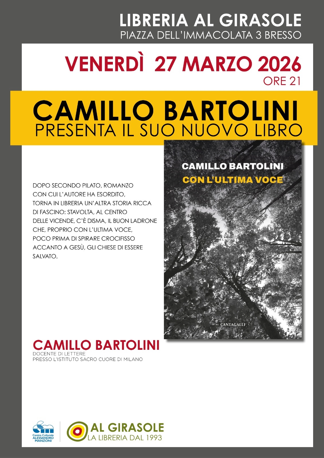 Il Centro Culturale A. Manzoni invita a un nuovo appuntamento letterario dedicato alla presentazione del libro “Con l’ultima voce” di Camillo Bartolini, docente di lettere presso l’Istituto Sacro Cuore di Milano.