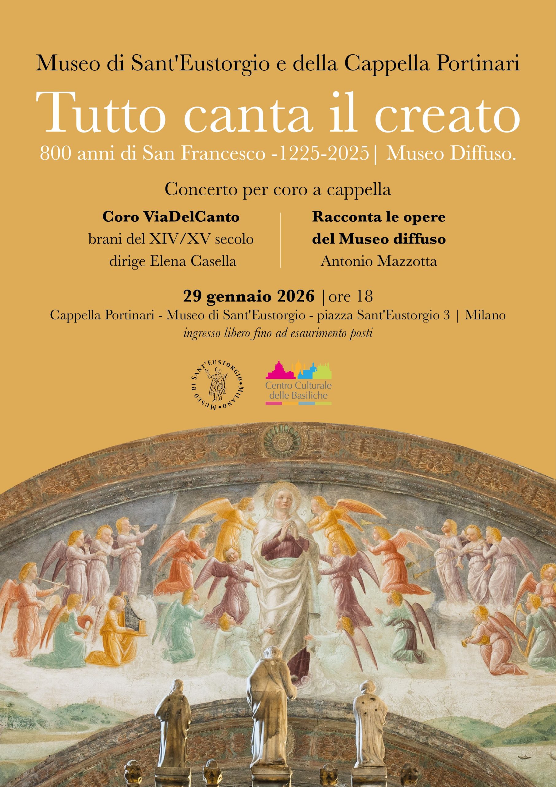 In occasione della chiusura del Museo Diffuso “800 anni di San Francesco. Tutto canta il creato”, il Museo di Sant’Eustorgio e della Cappella Portinari propone una serata speciale in cui musica, arte e parola si incontrano in uno dei luoghi più suggestivi della Milano storica.